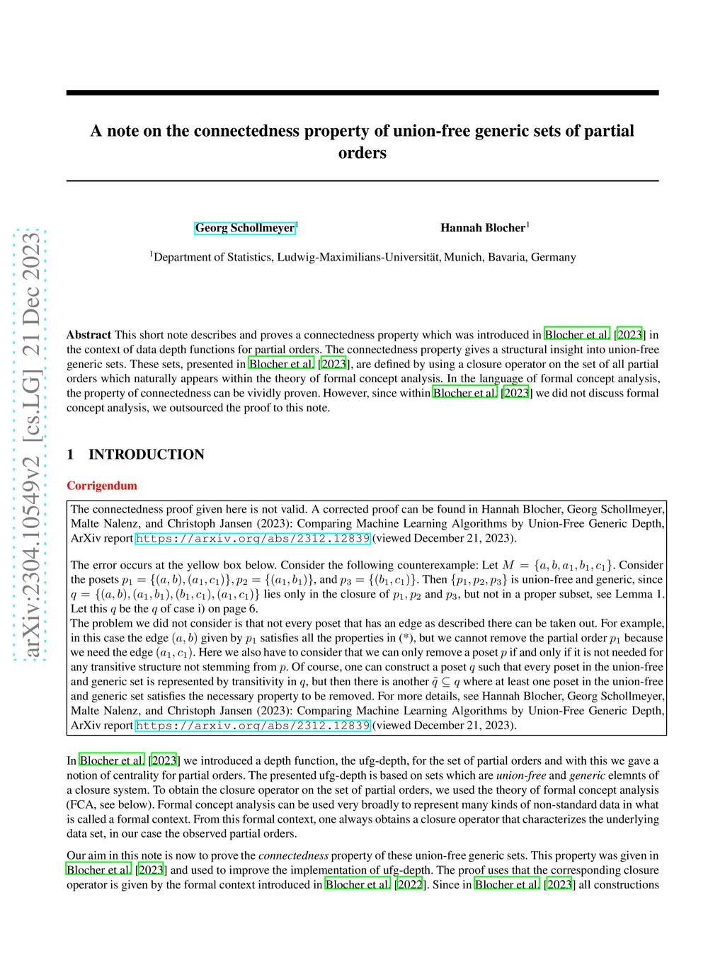 This short note describes and proves a connectedness property which was introduced in Blocher et al. [2023] in the context of data depth functions for partial orders. The connectedness property gives a structural insight into union-free generic sets. These sets, presented in Blocher et al. [2023], are defined by using a closure operator on the set of all partial orders which naturally appears within the theory of formal concept analysis. In the language of formal concept analysis, the property of connectedness can be vividly proven. However, since within Blocher et al. [2023] we did not discuss formal concept analysis, we outsourced the proof to this note.