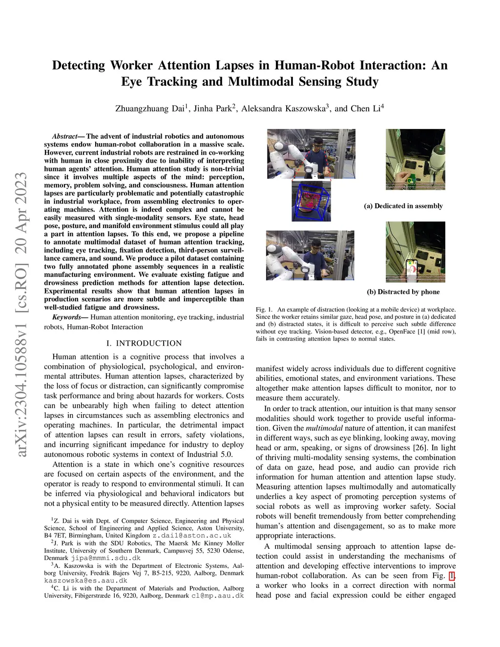 The advent of industrial robotics and autonomous systems endow human-robot collaboration in a massive scale. However, current industrial robots are restrained in co-working with human in close proximity due to inability of interpreting human agents' attention. Human attention study is non-trivial since it involves multiple aspects of the mind: perception, memory, problem solving, and consciousness. Human attention lapses are particularly problematic and potentially catastrophic in industrial workplace, from assembling electronics to operating machines. Attention is indeed complex and cannot be easily measured with single-modality sensors. Eye state, head pose, posture, and manifold environment stimulus could all play a part in attention lapses. To this end, we propose a pipeline to annotate multimodal dataset of human attention tracking, including eye tracking, fixation detection, third-person surveillance camera, and sound. We produce a pilot dataset containing two fully annotated phone assembly sequences in a realistic manufacturing environment. We evaluate existing fatigue and drowsiness prediction methods for attention lapse detection. Experimental results show that human attention lapses in production scenarios are more subtle and imperceptible than well-studied fatigue and drowsiness.