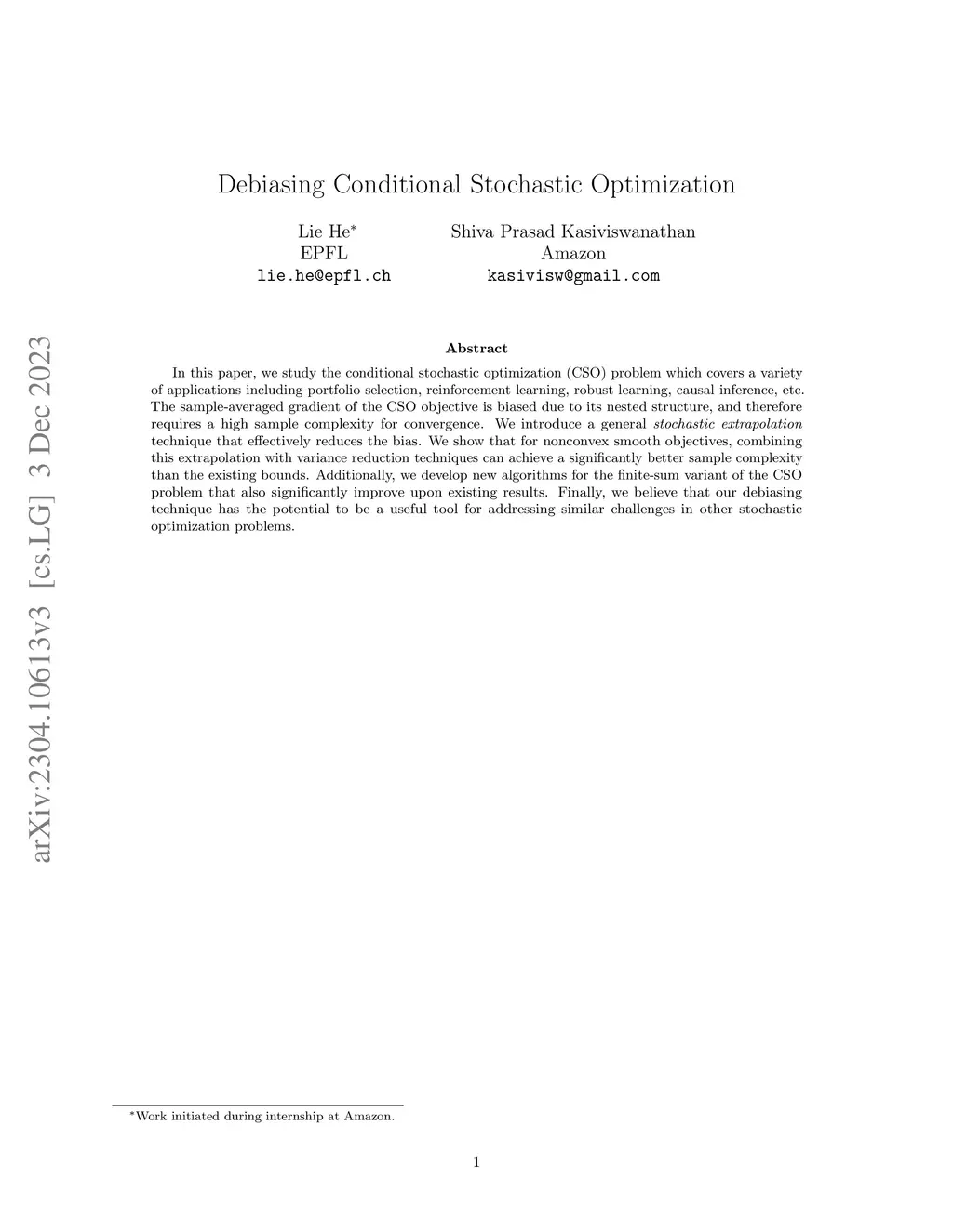 In this paper, we study the conditional stochastic optimization (CSO) problem which covers a variety of applications including portfolio selection, reinforcement learning, robust learning, causal inference, etc. The sample-averaged gradient of the CSO objective is biased due to its nested structure, and therefore requires a high sample complexity for convergence. We introduce a general stochastic extrapolation technique that effectively reduces the bias. We show that for nonconvex smooth objectives, combining this extrapolation with variance reduction techniques can achieve a significantly better sample complexity than the existing bounds. Additionally, we develop new algorithms for the finite-sum variant of the CSO problem that also significantly improve upon existing results. Finally, we believe that our debiasing technique has the potential to be a useful tool for addressing similar challenges in other stochastic optimization problems.