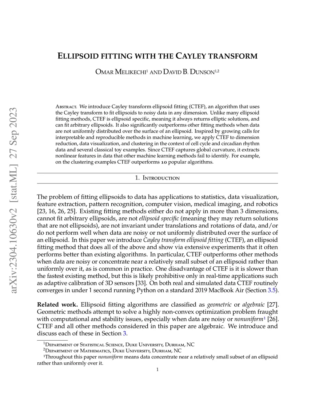 We introduce Cayley transform ellipsoid fitting (CTEF), an algorithm that uses the Cayley transform to fit ellipsoids to noisy data in any dimension. Unlike many ellipsoid fitting methods, CTEF is ellipsoid specific, meaning it always returns elliptic solutions, and can fit arbitrary ellipsoids. It also significantly outperforms other fitting methods when data are not uniformly distributed over the surface of an ellipsoid. Inspired by growing calls for interpretable and reproducible methods in machine learning, we apply CTEF to dimension reduction, data visualization, and clustering in the context of cell cycle and circadian rhythm data and several classical toy examples. Since CTEF captures global curvature, it extracts nonlinear features in data that other machine learning methods fail to identify. For example, on the clustering examples CTEF outperforms 10 popular algorithms.