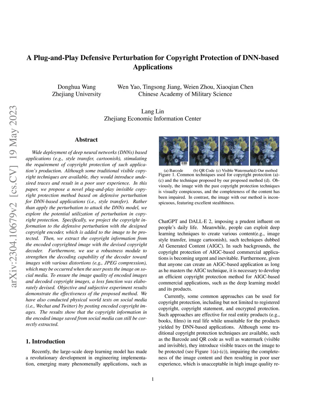 Wide deployment of deep neural networks (DNNs) based applications (e.g., style transfer, cartoonish), stimulating the requirement of copyright protection of such application's production. Although some traditional visible copyright techniques are available, they would introduce undesired traces and result in a poor user experience. In this paper, we propose a novel plug-and-play invisible copyright protection method based on defensive perturbation for DNN-based applications (i.e., style transfer). Rather than apply the perturbation to attack the DNNs model, we explore the potential utilization of perturbation in copyright protection. Specifically, we project the copyright information to the defensive perturbation with the designed copyright encoder, which is added to the image to be protected. Then, we extract the copyright information from the encoded copyrighted image with the devised copyright decoder. Furthermore, we use a robustness module to strengthen the decoding capability of the decoder toward images with various distortions (e.g., JPEG compression), which may be occurred when the user posts the image on social media. To ensure the image quality of encoded images and decoded copyright images, a loss function was elaborately devised. Objective and subjective experiment results demonstrate the effectiveness of the proposed method. We have also conducted physical world tests on social media (i.e., Wechat and Twitter) by posting encoded copyright images. The results show that the copyright information in the encoded image saved from social media can still be correctly extracted.