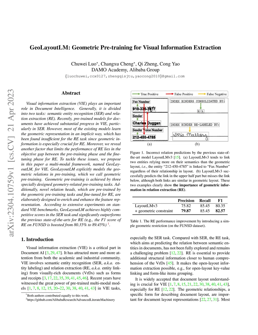 Visual information extraction (VIE) plays an important role in Document Intelligence. Generally, it is divided into two tasks: semantic entity recognition (SER) and relation extraction (RE). Recently, pre-trained models for documents have achieved substantial progress in VIE, particularly in SER. However, most of the existing models learn the geometric representation in an implicit way, which has been found insufficient for the RE task since geometric information is especially crucial for RE. Moreover, we reveal another factor that limits the performance of RE lies in the objective gap between the pre-training phase and the fine-tuning phase for RE. To tackle these issues, we propose in this paper a multi-modal framework, named GeoLayoutLM, for VIE. GeoLayoutLM explicitly models the geometric relations in pre-training, which we call geometric pre-training. Geometric pre-training is achieved by three specially designed geometry-related pre-training tasks. Additionally, novel relation heads, which are pre-trained by the geometric pre-training tasks and fine-tuned for RE, are elaborately designed to enrich and enhance the feature representation. According to extensive experiments on standard VIE benchmarks, GeoLayoutLM achieves highly competitive scores in the SER task and significantly outperforms the previous state-of-the-arts for RE (\eg, the F1 score of RE on FUNSD is boosted from 80.35\% to 89.45\%). The code and models are publicly available at https://github.com/AlibabaResearch/AdvancedLiterateMachinery/tree/main/DocumentUnderstanding/GeoLayoutLM