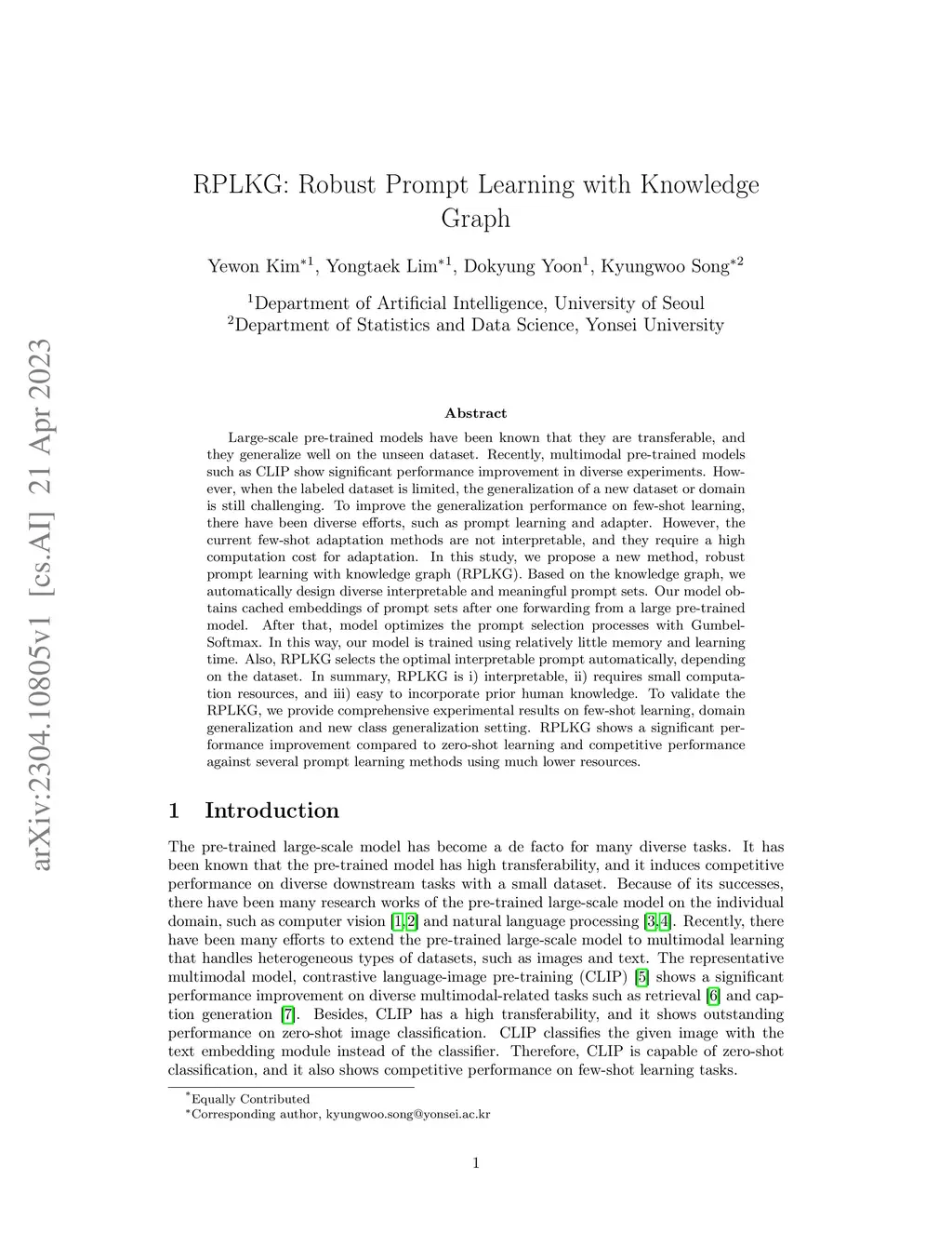 Large-scale pre-trained models such as CLIP excel in transferability and robust generalization across diverse datasets. However, adapting these models to new datasets or domains is computationally costly, especially in low-resource or few-shot settings, and existing prompt-learning methods often lack interpretability. We introduce Efficient Prompt Learning with Knowledge Graph (EPLKG), which uses a knowledge graph to curate diverse, interpretable prompts and, where KG coverage is limited, augments this bank with LLM-generated human-readable visual descriptions. EPLKG operates entirely on cached CLIP image and text embeddings and employs a lightweight Gumbel-Softmax module to select a single prompt per image-class pair, enabling low-memory, fast training. Across 11 benchmarks, EPLKG reduces per-image training time by up to 45 percent and peak GPU memory by around 30 to 40 percent compared to strong prompt-learning baselines, while keeping the average base-new harmonic-mean accuracy within 2 percentage points, thereby improving the efficiency of model adaptation without sacrificing competitive performance or interpretability.
