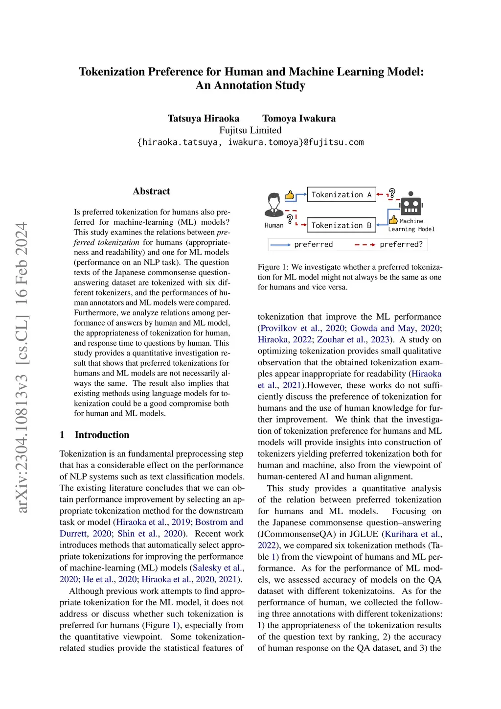 Is preferred tokenization for humans also preferred for machine-learning (ML) models? This study examines the relations between preferred tokenization for humans (appropriateness and readability) and one for ML models (performance on an NLP task). The question texts of the Japanese commonsense question-answering dataset are tokenized with six different tokenizers, and the performances of human annotators and ML models were compared. Furthermore, we analyze relations among performance of answers by human and ML model, the appropriateness of tokenization for human, and response time to questions by human. This study provides a quantitative investigation result that shows that preferred tokenizations for humans and ML models are not necessarily always the same. The result also implies that existing methods using language models for tokenization could be a good compromise both for human and ML models.