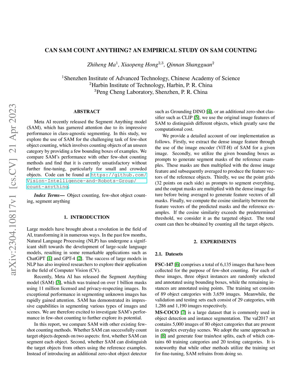 Meta AI recently released the Segment Anything model (SAM), which has garnered attention due to its impressive performance in class-agnostic segmenting. In this study, we explore the use of SAM for the challenging task of few-shot object counting, which involves counting objects of an unseen category by providing a few bounding boxes of examples. We compare SAM's performance with other few-shot counting methods and find that it is currently unsatisfactory without further fine-tuning, particularly for small and crowded objects. Code can be found at \url{https://github.com/Vision-Intelligence-and-Robots-Group/count-anything}.