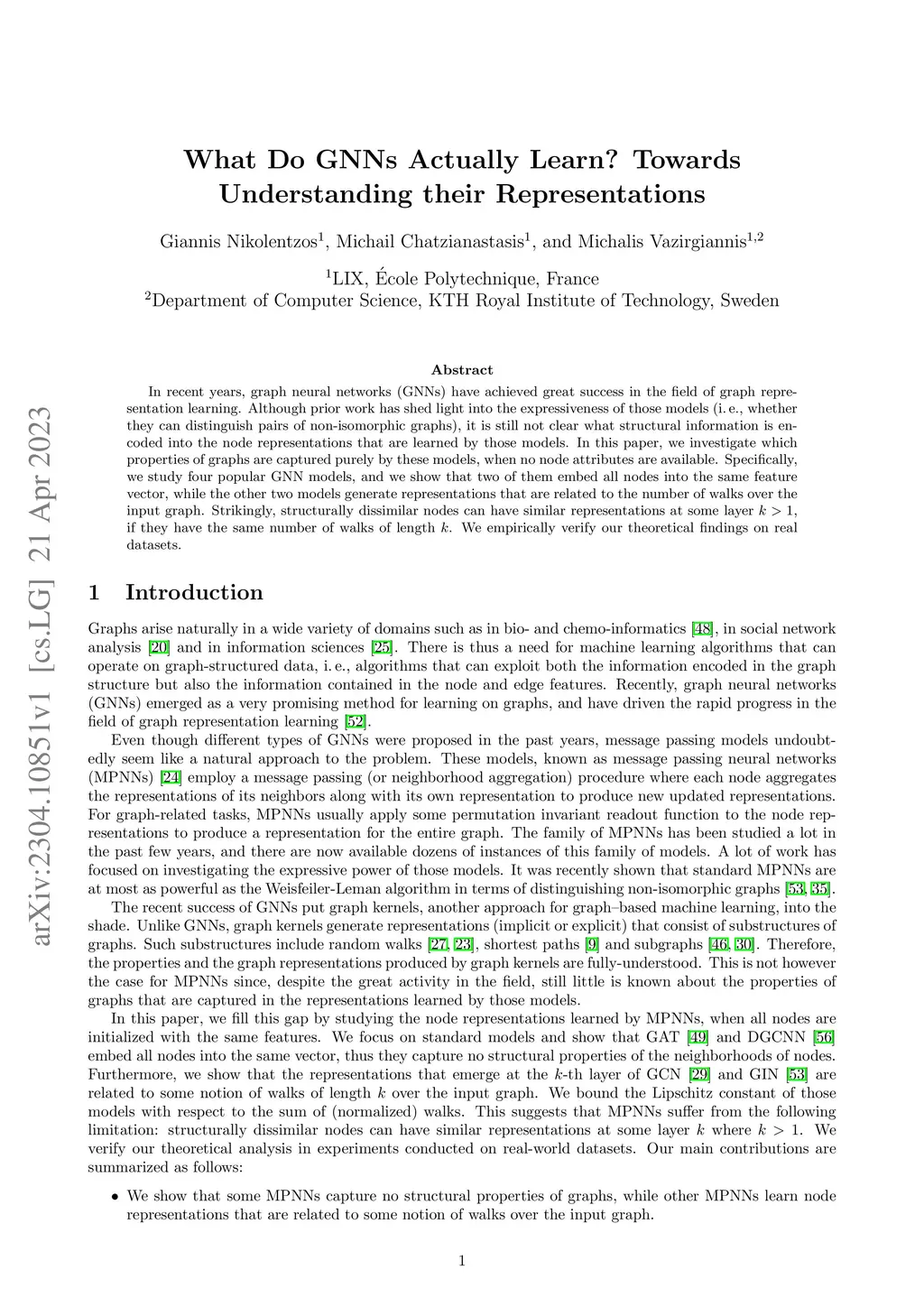 In recent years, graph neural networks (GNNs) have achieved great success in the field of graph representation learning. Although prior work has shed light into the expressiveness of those models (\ie whether they can distinguish pairs of non-isomorphic graphs), it is still not clear what structural information is encoded into the node representations that are learned by those models. In this paper, we investigate which properties of graphs are captured purely by these models, when no node attributes are available. Specifically, we study four popular GNN models, and we show that two of them embed all nodes into the same feature vector, while the other two models generate representations that are related to the number of walks over the input graph. Strikingly, structurally dissimilar nodes can have similar representations at some layer , if they have the same number of walks of length . We empirically verify our theoretical findings on real datasets.
