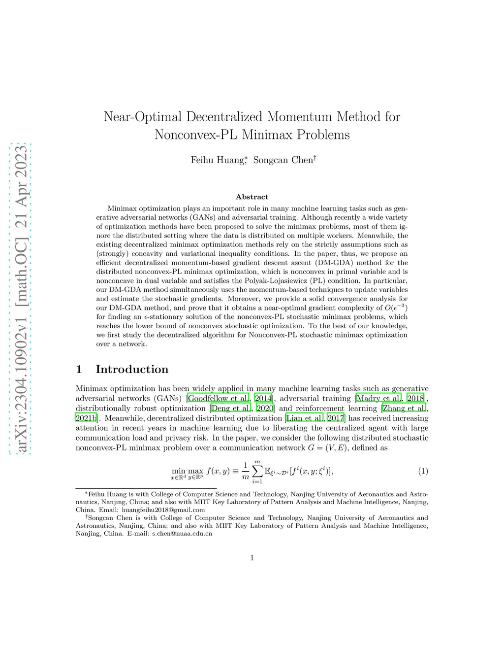 Minimax optimization plays an important role in many machine learning tasks such as generative adversarial networks (GANs) and adversarial training. Although recently a wide variety of optimization methods have been proposed to solve the minimax problems, most of them ignore the distributed setting where the data is distributed on multiple workers. Meanwhile, the existing decentralized minimax optimization methods rely on the strictly assumptions such as (strongly) concavity and variational inequality conditions. In the paper, thus, we propose an efficient decentralized momentum-based gradient descent ascent (DM-GDA) method for the distributed nonconvex-PL minimax optimization, which is nonconvex in primal variable and is nonconcave in dual variable and satisfies the Polyak-Lojasiewicz (PL) condition. In particular, our DM-GDA method simultaneously uses the momentum-based techniques to update variables and estimate the stochastic gradients. Moreover, we provide a solid convergence analysis for our DM-GDA method, and prove that it obtains a near-optimal gradient complexity of for finding an -stationary solution of the nonconvex-PL stochastic minimax problems, which reaches the lower bound of nonconvex stochastic optimization. To the best of our knowledge, we first study the decentralized algorithm for Nonconvex-PL stochastic minimax optimization over a network.