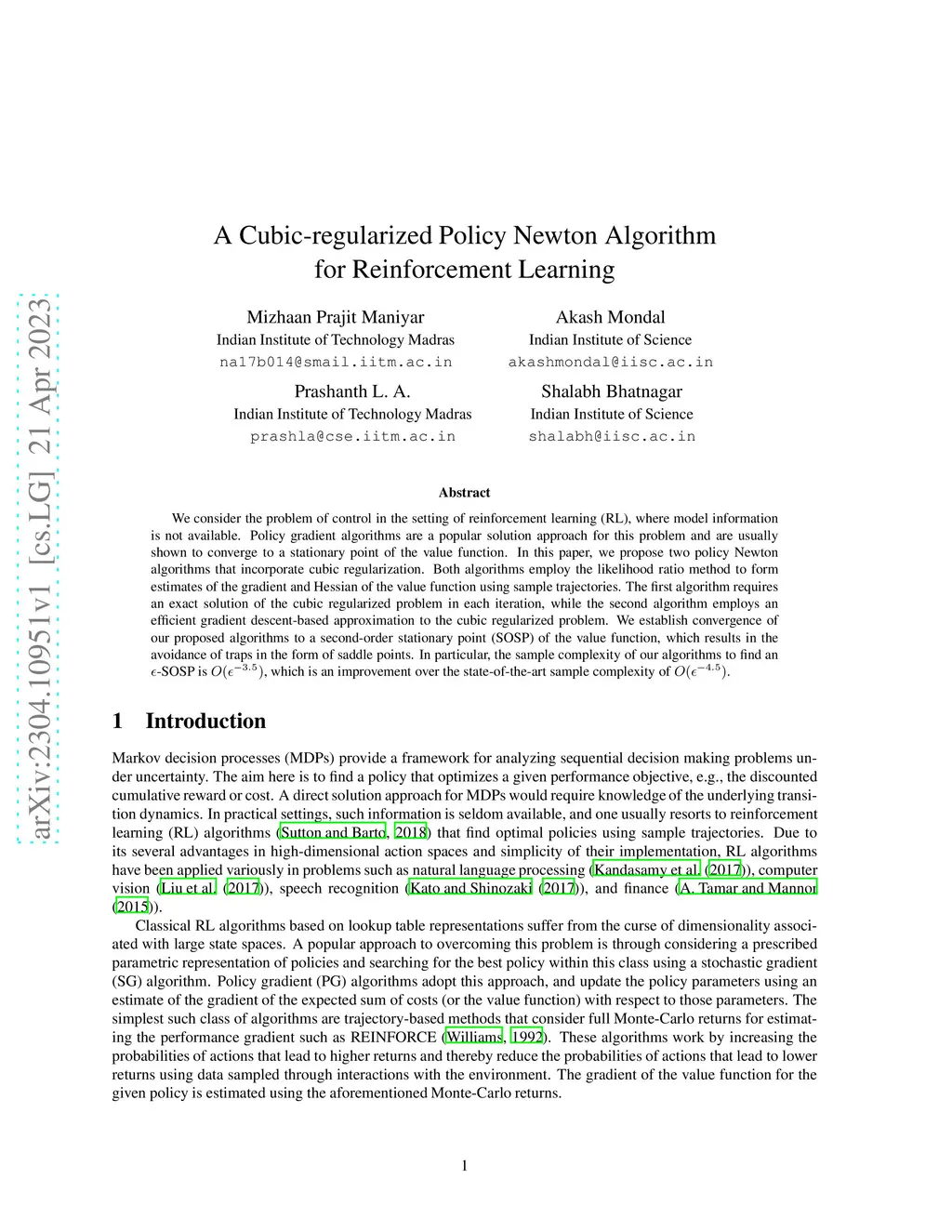 A Cubic-regularized Policy Newton Algorithm for Reinforcement Learning