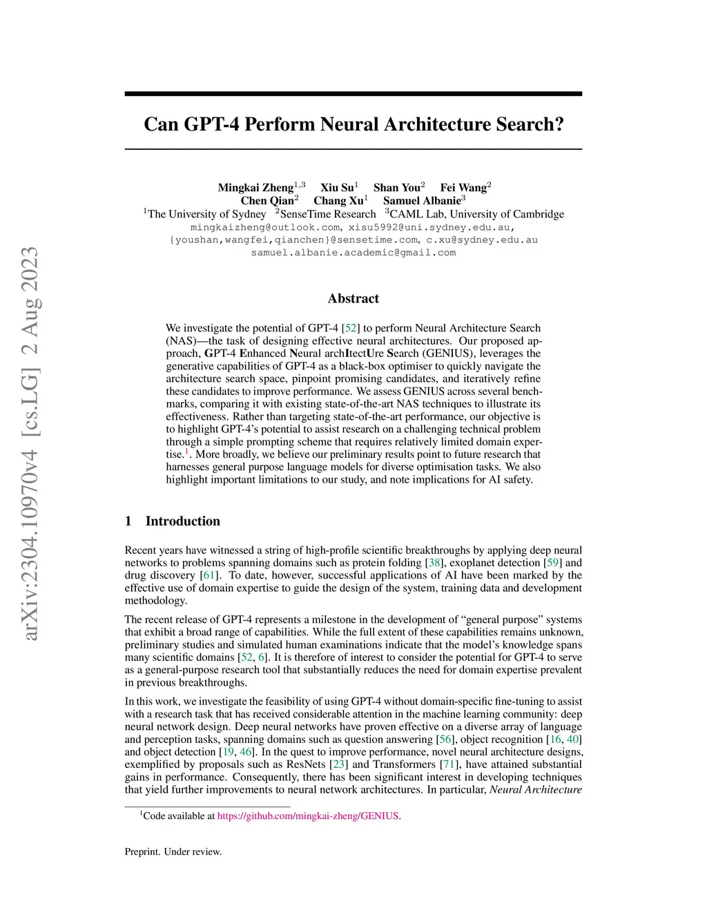 We investigate the potential of GPT-4~\cite{gpt4} to perform Neural Architecture Search (NAS) -- the task of designing effective neural architectures. Our proposed approach, \textbf{G}PT-4 \textbf{E}nhanced \textbf{N}eural arch\textbf{I}tect\textbf{U}re \textbf{S}earch (GENIUS), leverages the generative capabilities of GPT-4 as a black-box optimiser to quickly navigate the architecture search space, pinpoint promising candidates, and iteratively refine these candidates to improve performance. We assess GENIUS across several benchmarks, comparing it with existing state-of-the-art NAS techniques to illustrate its effectiveness. Rather than targeting state-of-the-art performance, our objective is to highlight GPT-4's potential to assist research on a challenging technical problem through a simple prompting scheme that requires relatively limited domain expertise\footnote{Code available at \href{https://github.com/mingkai-zheng/GENIUS}{https://github.com/mingkai-zheng/GENIUS}.}. More broadly, we believe our preliminary results point to future research that harnesses general purpose language models for diverse optimisation tasks. We also highlight important limitations to our study, and note implications for AI safety.