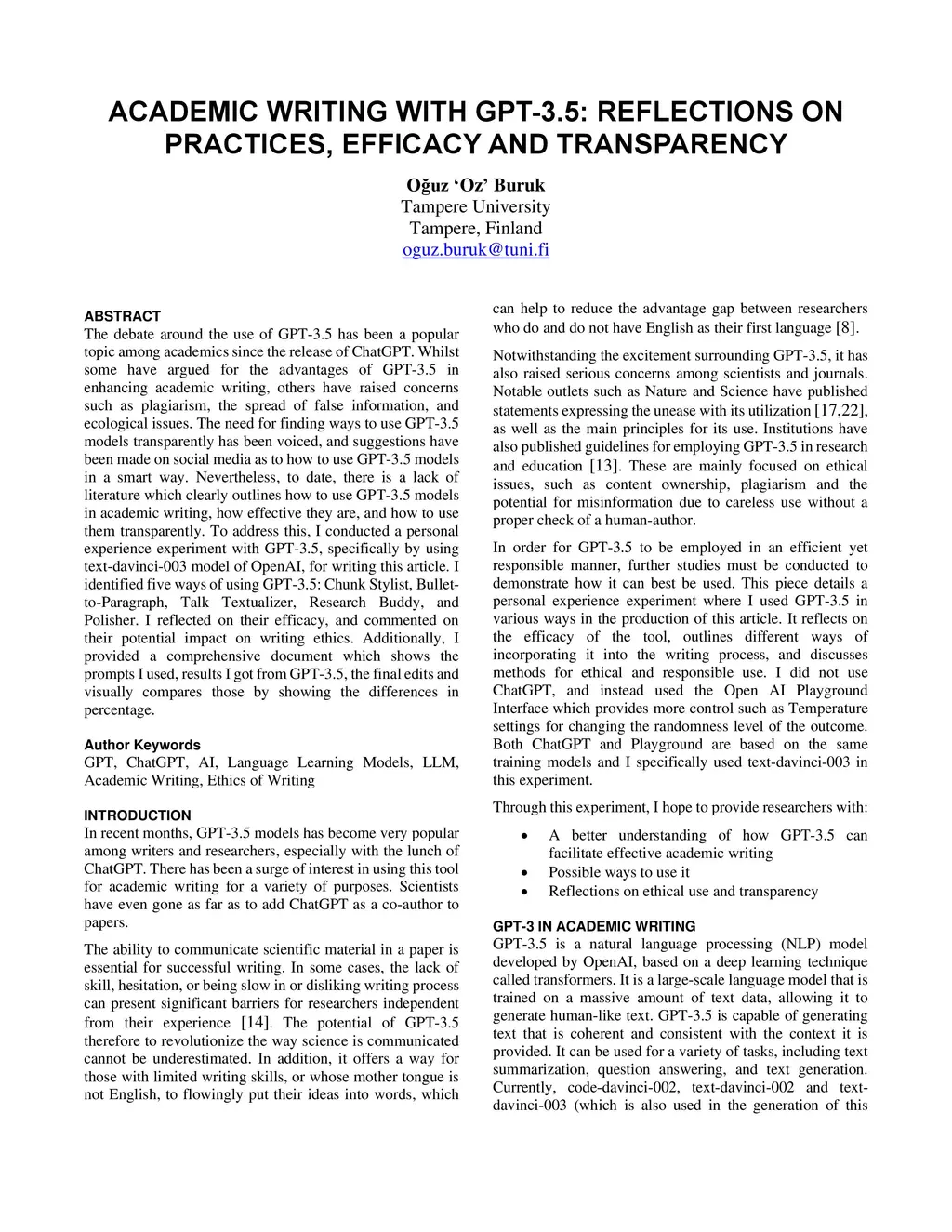 The debate around the use of GPT 3.5 has been a popular topic among academics since the release of ChatGPT. Whilst some have argued for the advantages of GPT 3.5 in enhancing academic writing, others have raised concerns such as plagiarism, the spread of false information, and ecological issues. The need for finding ways to use GPT 3.5 models transparently has been voiced, and suggestions have been made on social media as to how to use GPT 3.5 models in a smart way. Nevertheless, to date, there is a lack of literature which clearly outlines how to use GPT 3.5 models in academic writing, how effective they are, and how to use them transparently. To address this, I conducted a personal experience experiment with GPT 3.5, specifically by using OpenAI text davinci 003 model, for writing this article. I identified five ways of using GPT 3.5: Chunk Stylist, Bullet to Paragraph, Talk Textualizer, Research Buddy, and Polisher. I reflected on their efficacy, and commented on their potential impact on writing ethics. Additionally, I provided a comprehensive document which shows the prompts I used, results I got from GPT 3.5, the final edits and visually compares those by showing the differences in percentages.
