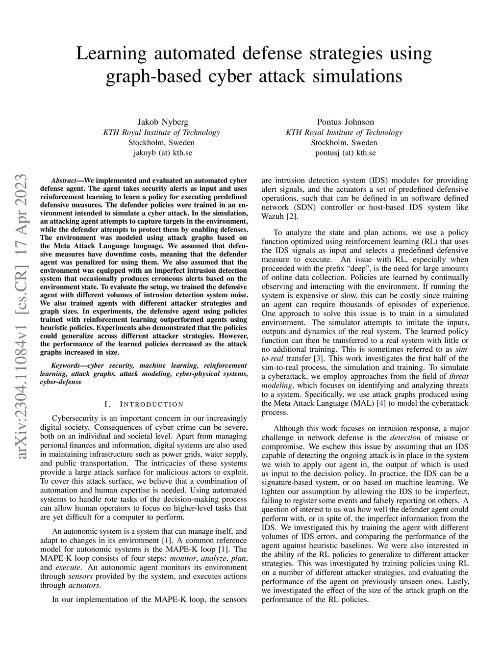 We implemented and evaluated an automated cyber defense agent. The agent takes security alerts as input and uses reinforcement learning to learn a policy for executing predefined defensive measures. The defender policies were trained in an environment intended to simulate a cyber attack. In the simulation, an attacking agent attempts to capture targets in the environment, while the defender attempts to protect them by enabling defenses. The environment was modeled using attack graphs based on the Meta Attack Language language. We assumed that defensive measures have downtime costs, meaning that the defender agent was penalized for using them. We also assumed that the environment was equipped with an imperfect intrusion detection system that occasionally produces erroneous alerts based on the environment state. To evaluate the setup, we trained the defensive agent with different volumes of intrusion detection system noise. We also trained agents with different attacker strategies and graph sizes. In experiments, the defensive agent using policies trained with reinforcement learning outperformed agents using heuristic policies. Experiments also demonstrated that the policies could generalize across different attacker strategies. However, the performance of the learned policies decreased as the attack graphs increased in size.