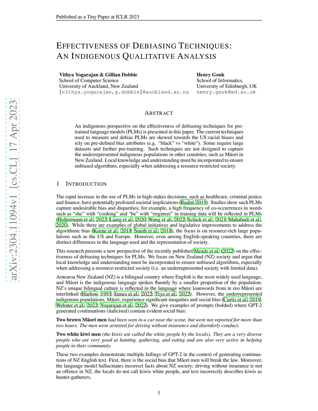An indigenous perspective on the effectiveness of debiasing techniques for pre-trained language models (PLMs) is presented in this paper. The current techniques used to measure and debias PLMs are skewed towards the US racial biases and rely on pre-defined bias attributes (e.g. "black" vs "white"). Some require large datasets and further pre-training. Such techniques are not designed to capture the underrepresented indigenous populations in other countries, such as M\=aori in New Zealand. Local knowledge and understanding must be incorporated to ensure unbiased algorithms, especially when addressing a resource-restricted society.