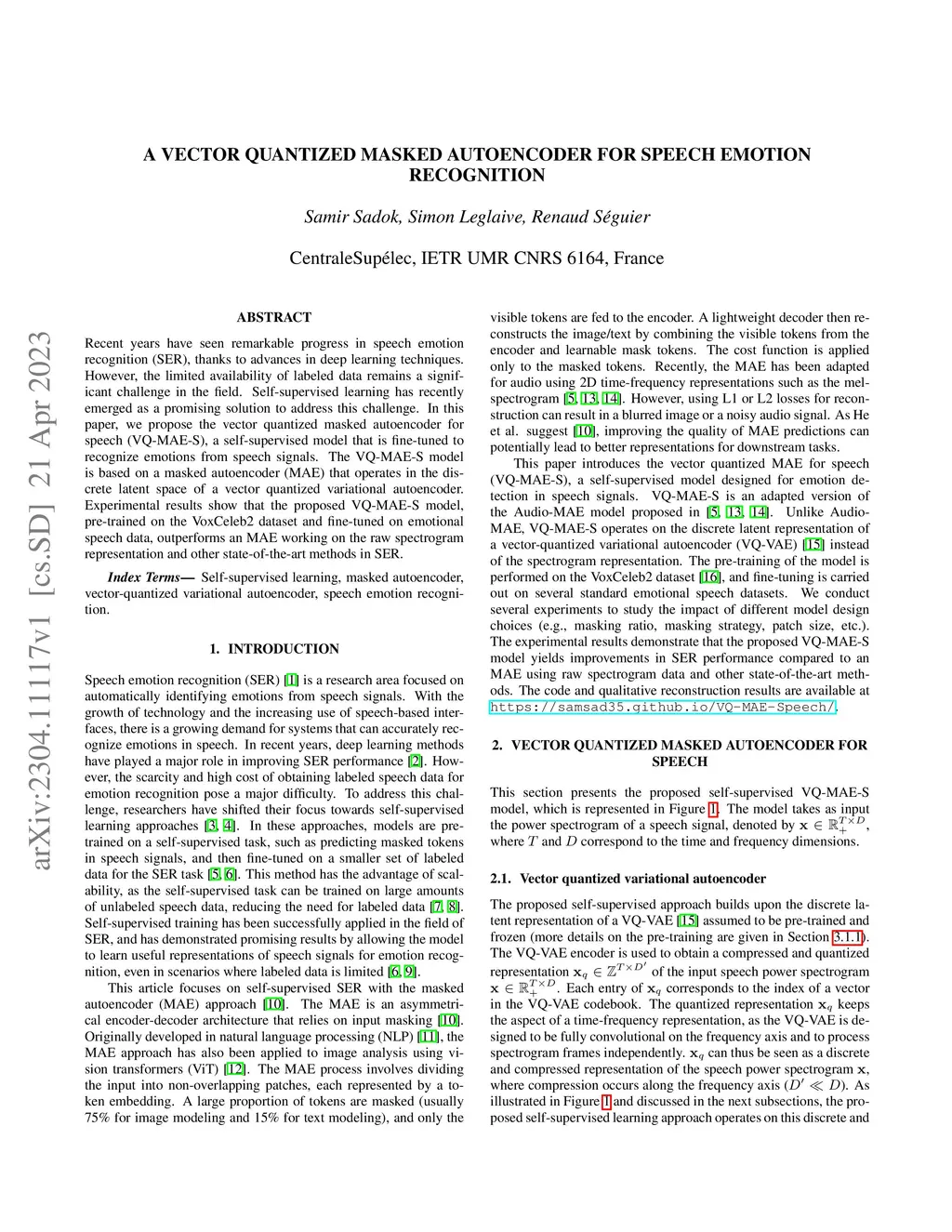 A vector quantized masked autoencoder for speech emotion recognition
