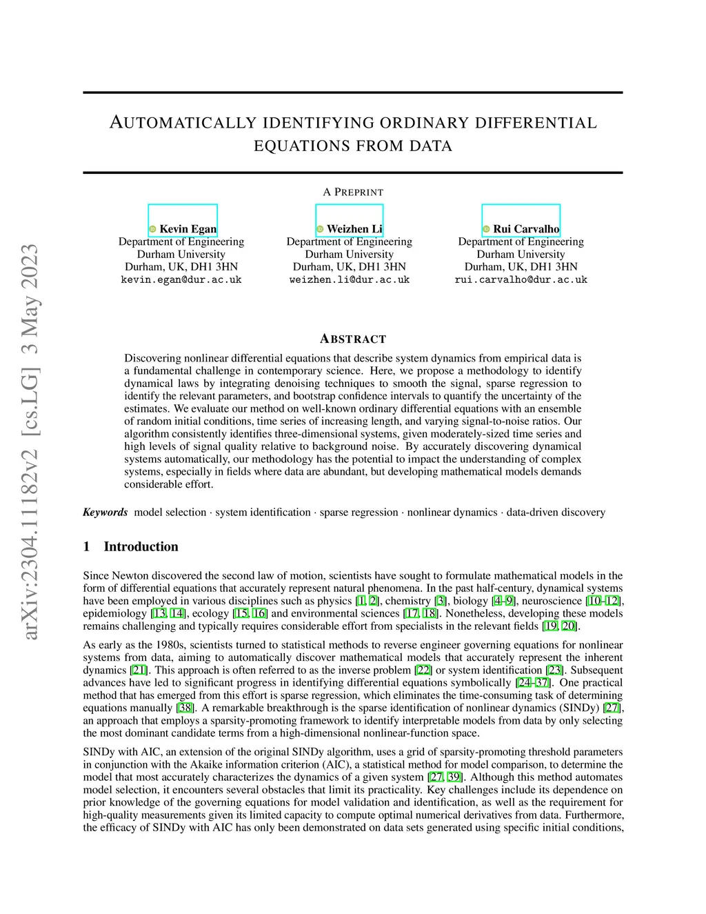 Discovering nonlinear differential equations that describe system dynamics from empirical data is a fundamental challenge in contemporary science. Here, we propose a methodology to automatically identify dynamical laws by integrating denoising techniques, sparse regression, and bootstrap confidence intervals. We evaluate our method on well-known ordinary differential equations with an ensemble of random initial conditions, time series of increasing length, and varying signal-to-noise ratios. Our algorithm consistently identifies three-dimensional systems, given moderately-sized time series and high signal quality levels relative to background noise. By accurately identifying dynamical systems, our methodology has the potential to impact diverse fields, such as the physical and biological sciences, as well as engineering, where understanding complex systems is crucial.