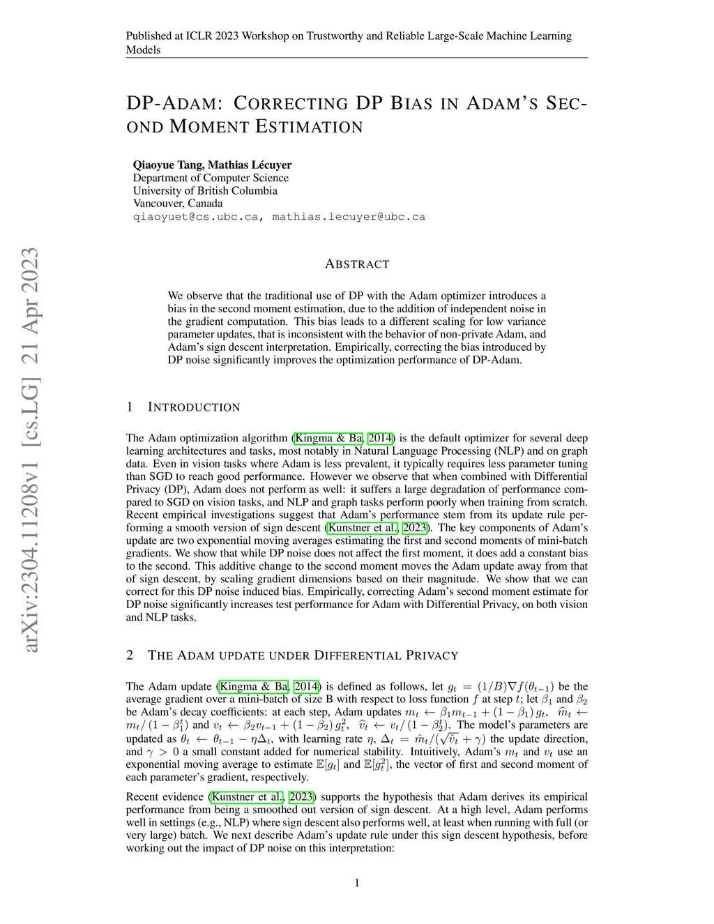 We observe that the traditional use of DP with the Adam optimizer introduces a bias in the second moment estimation, due to the addition of independent noise in the gradient computation. This bias leads to a different scaling for low variance parameter updates, that is inconsistent with the behavior of non-private Adam, and Adam's sign descent interpretation. Empirically, correcting the bias introduced by DP noise significantly improves the optimization performance of DP-Adam.
