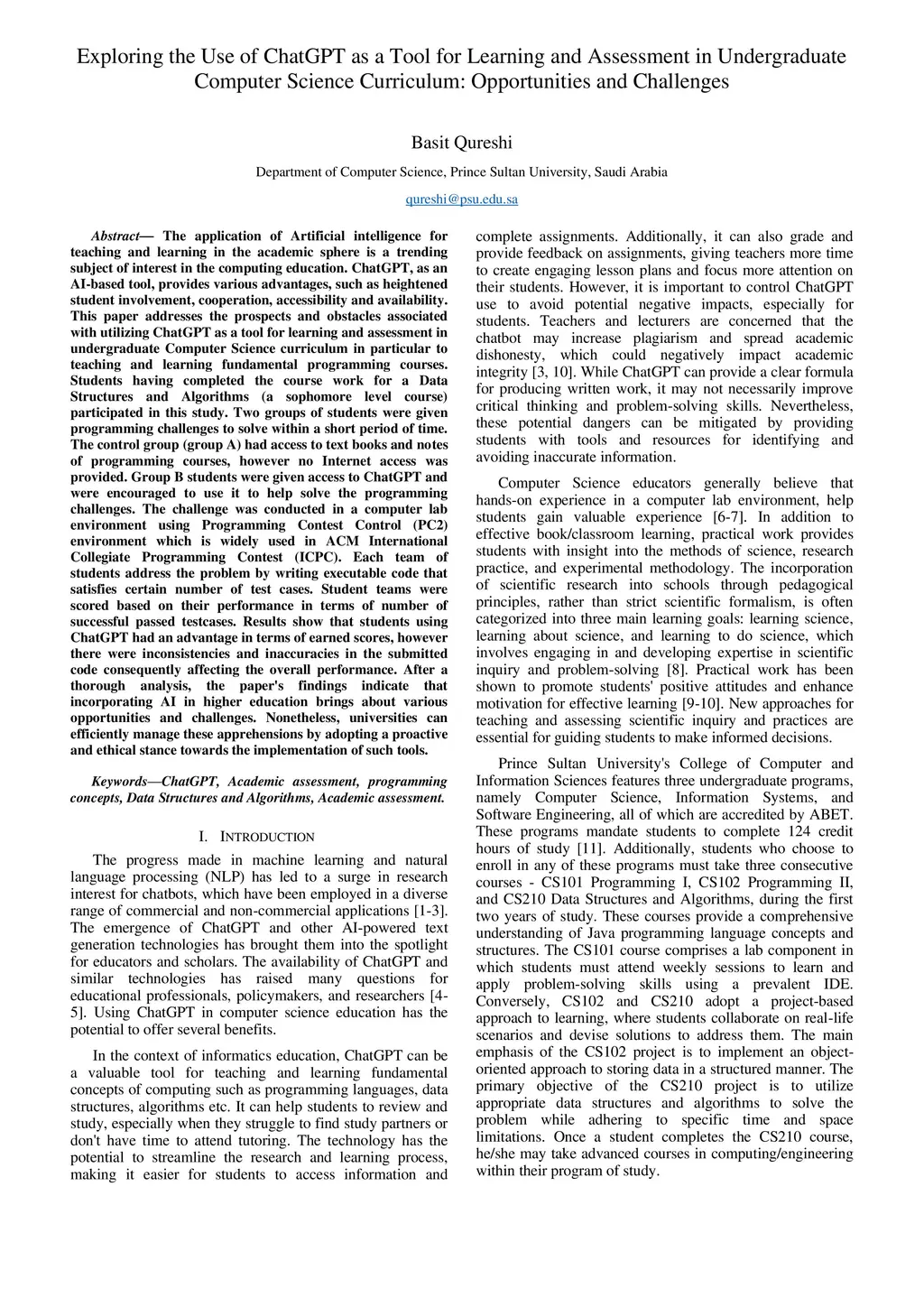 The application of Artificial intelligence for teaching and learning in the academic sphere is a trending subject of interest in the computing education. ChatGPT, as an AI-based tool, provides various advantages, such as heightened student involvement, cooperation, accessibility and availability. This paper addresses the prospects and obstacles associated with utilizing ChatGPT as a tool for learning and assessment in undergraduate Computer Science curriculum in particular to teaching and learning fundamental programming courses. Students having completed the course work for a Data Structures and Algorithms (a sophomore level course) participated in this study. Two groups of students were given programming challenges to solve within a short period of time. The control group (group A) had access to text books and notes of programming courses, however no Internet access was provided. Group B students were given access to ChatGPT and were encouraged to use it to help solve the programming challenges. The challenge was conducted in a computer lab environment using PC2 environment. Each team of students address the problem by writing executable code that satisfies certain number of test cases. Student teams were scored based on their performance in terms of number of successful passed testcases. Results show that students using ChatGPT had an advantage in terms of earned scores, however there were inconsistencies and inaccuracies in the submitted code consequently affecting the overall performance. After a thorough analysis, the paper's findings indicate that incorporating AI in higher education brings about various opportunities and challenges.