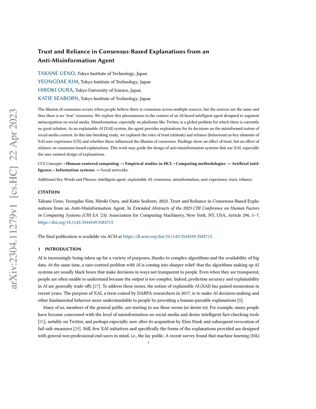 The illusion of consensus occurs when people believe there is consensus across multiple sources, but the sources are the same and thus there is no "true" consensus. We explore this phenomenon in the context of an AI-based intelligent agent designed to augment metacognition on social media. Misinformation, especially on platforms like Twitter, is a global problem for which there is currently no good solution. As an explainable AI (XAI) system, the agent provides explanations for its decisions on the misinformed nature of social media content. In this late-breaking study, we explored the roles of trust (attitude) and reliance (behaviour) as key elements of XAI user experience (UX) and whether these influenced the illusion of consensus. Findings show no effect of trust, but an effect of reliance on consensus-based explanations. This work may guide the design of anti-misinformation systems that use XAI, especially the user-centred design of explanations.