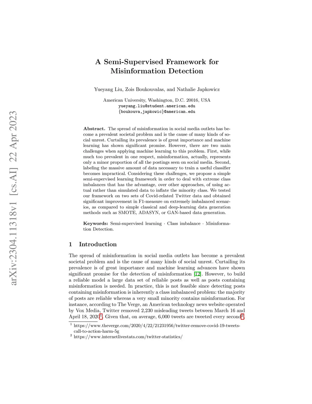 The spread of misinformation in social media outlets has become a prevalent societal problem and is the cause of many kinds of social unrest. Curtailing its prevalence is of great importance and machine learning has shown significant promise. However, there are two main challenges when applying machine learning to this problem. First, while much too prevalent in one respect, misinformation, actually, represents only a minor proportion of all the postings seen on social media. Second, labeling the massive amount of data necessary to train a useful classifier becomes impractical. Considering these challenges, we propose a simple semi-supervised learning framework in order to deal with extreme class imbalances that has the advantage, over other approaches, of using actual rather than simulated data to inflate the minority class. We tested our framework on two sets of Covid-related Twitter data and obtained significant improvement in F1-measure on extremely imbalanced scenarios, as compared to simple classical and deep-learning data generation methods such as SMOTE, ADASYN, or GAN-based data generation.