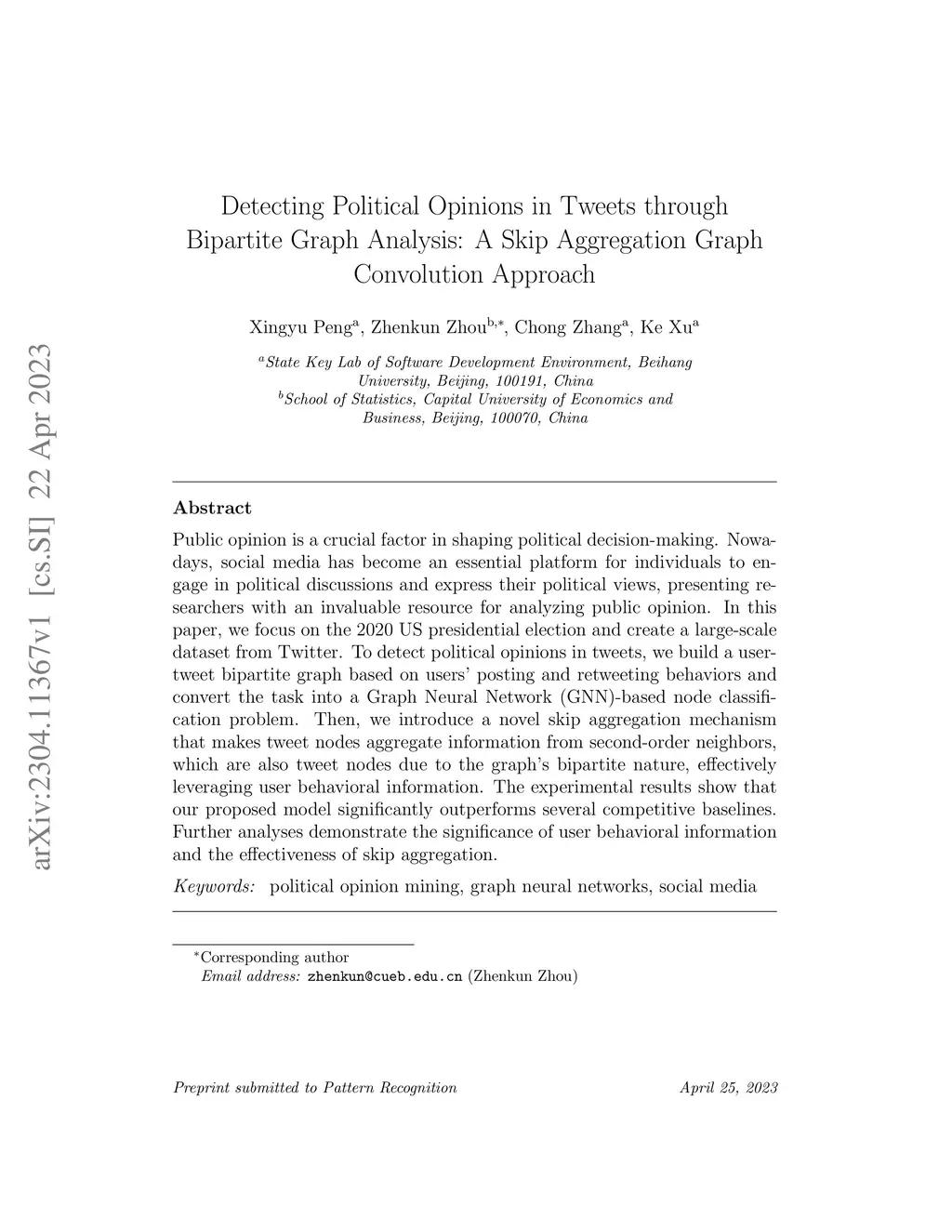 Public opinion is a crucial factor in shaping political decision-making. Nowadays, social media has become an essential platform for individuals to engage in political discussions and express their political views, presenting researchers with an invaluable resource for analyzing public opinion. In this paper, we focus on the 2020 US presidential election and create a large-scale dataset from Twitter. To detect political opinions in tweets, we build a user-tweet bipartite graph based on users' posting and retweeting behaviors and convert the task into a Graph Neural Network (GNN)-based node classification problem. Then, we introduce a novel skip aggregation mechanism that makes tweet nodes aggregate information from second-order neighbors, which are also tweet nodes due to the graph's bipartite nature, effectively leveraging user behavioral information. The experimental results show that our proposed model significantly outperforms several competitive baselines. Further analyses demonstrate the significance of user behavioral information and the effectiveness of skip aggregation.