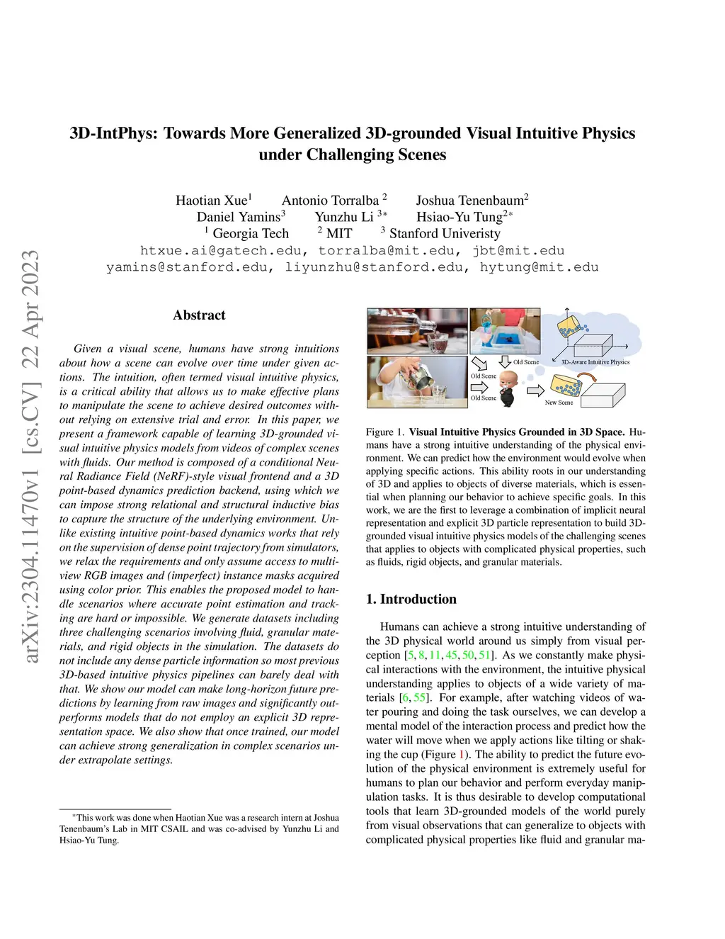 Given a visual scene, humans have strong intuitions about how a scene can evolve over time under given actions. The intuition, often termed visual intuitive physics, is a critical ability that allows us to make effective plans to manipulate the scene to achieve desired outcomes without relying on extensive trial and error. In this paper, we present a framework capable of learning 3D-grounded visual intuitive physics models from videos of complex scenes with fluids. Our method is composed of a conditional Neural Radiance Field (NeRF)-style visual frontend and a 3D point-based dynamics prediction backend, using which we can impose strong relational and structural inductive bias to capture the structure of the underlying environment. Unlike existing intuitive point-based dynamics works that rely on the supervision of dense point trajectory from simulators, we relax the requirements and only assume access to multi-view RGB images and (imperfect) instance masks acquired using color prior. This enables the proposed model to handle scenarios where accurate point estimation and tracking are hard or impossible. We generate datasets including three challenging scenarios involving fluid, granular materials, and rigid objects in the simulation. The datasets do not include any dense particle information so most previous 3D-based intuitive physics pipelines can barely deal with that. We show our model can make long-horizon future predictions by learning from raw images and significantly outperforms models that do not employ an explicit 3D representation space. We also show that once trained, our model can achieve strong generalization in complex scenarios under extrapolate settings.