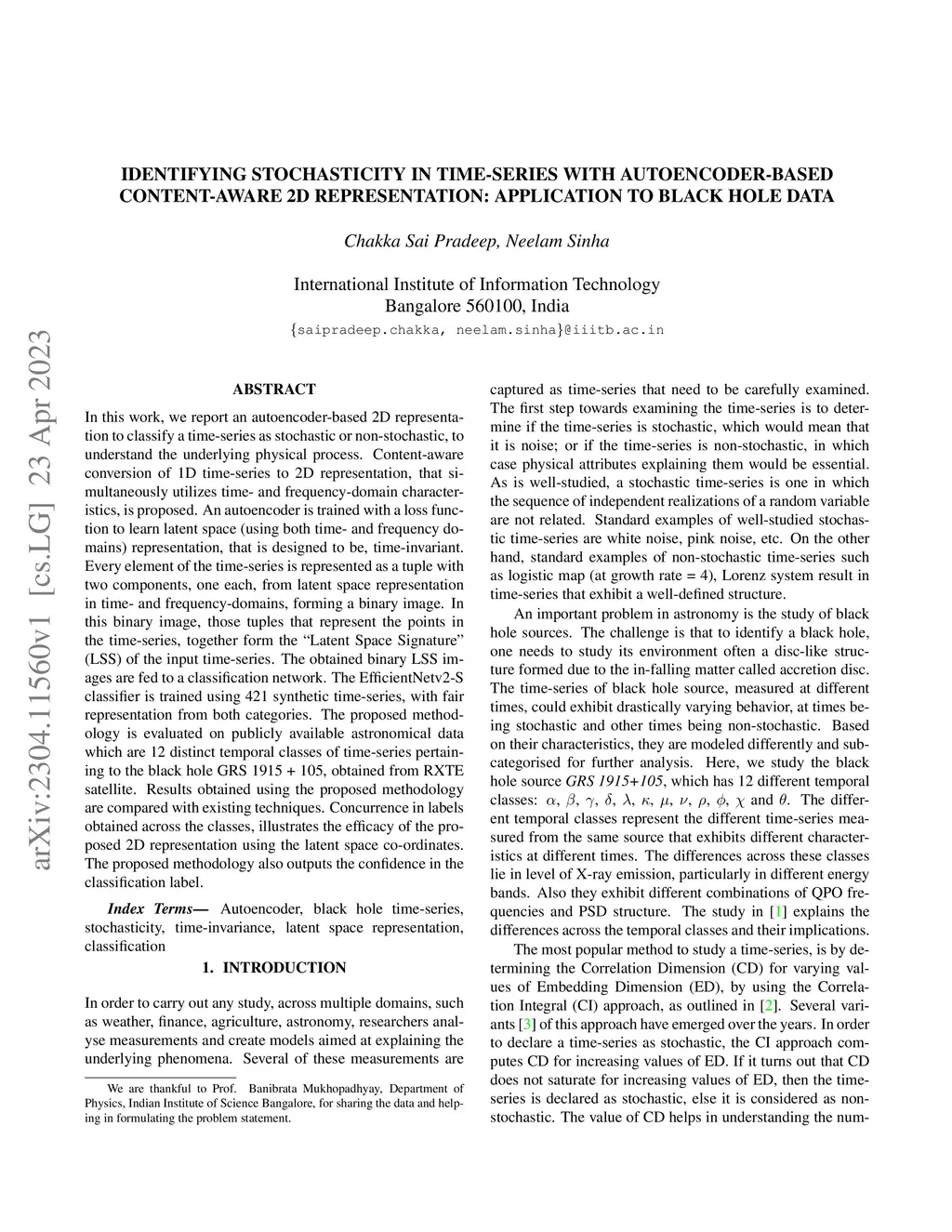 In this work, we report an autoencoder-based 2D representation to classify a time-series as stochastic or non-stochastic, to understand the underlying physical process. Content-aware conversion of 1D time-series to 2D representation, that simultaneously utilizes time- and frequency-domain characteristics, is proposed. An autoencoder is trained with a loss function to learn latent space (using both time- and frequency domains) representation, that is designed to be, time-invariant. Every element of the time-series is represented as a tuple with two components, one each, from latent space representation in time- and frequency-domains, forming a binary image. In this binary image, those tuples that represent the points in the time-series, together form the ``Latent Space Signature" (LSS) of the input time-series. The obtained binary LSS images are fed to a classification network. The EfficientNetv2-S classifier is trained using 421 synthetic time-series, with fair representation from both categories. The proposed methodology is evaluated on publicly available astronomical data which are 12 distinct temporal classes of time-series pertaining to the black hole GRS 1915 + 105, obtained from RXTE satellite. Results obtained using the proposed methodology are compared with existing techniques. Concurrence in labels obtained across the classes, illustrates the efficacy of the proposed 2D representation using the latent space co-ordinates. The proposed methodology also outputs the confidence in the classification label.
