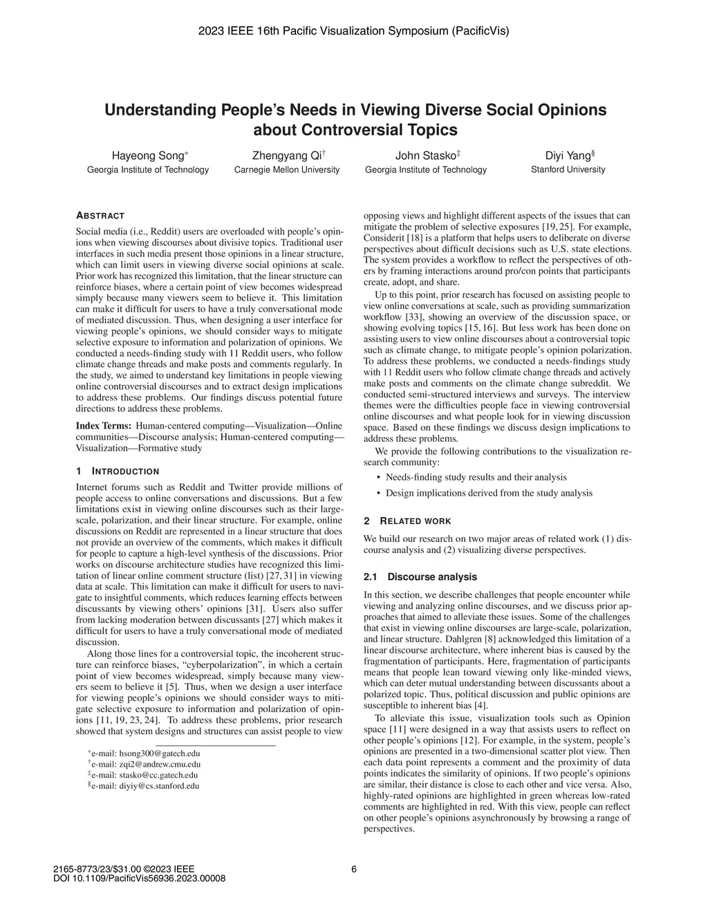 Social media (i.e., Reddit) users are overloaded with people's opinions when viewing discourses about divisive topics. Traditional user interfaces in such media present those opinions in a linear structure, which can limit users in viewing diverse social opinions at scale. Prior work has recognized this limitation, that the linear structure can reinforce biases, where a certain point of view becomes widespread simply because many viewers seem to believe it. This limitation can make it difficult for users to have a truly conversational mode of mediated discussion. Thus, when designing a user interface for viewing people's opinions, we should consider ways to mitigate selective exposure to information and polarization of opinions. We conducted a needs-finding study with 11 Reddit users, who follow climate change threads and make posts and comments regularly. In the study, we aimed to understand key limitations in people viewing online controversial discourses and to extract design implications to address these problems. Our findings discuss potential future directions to address these problems.