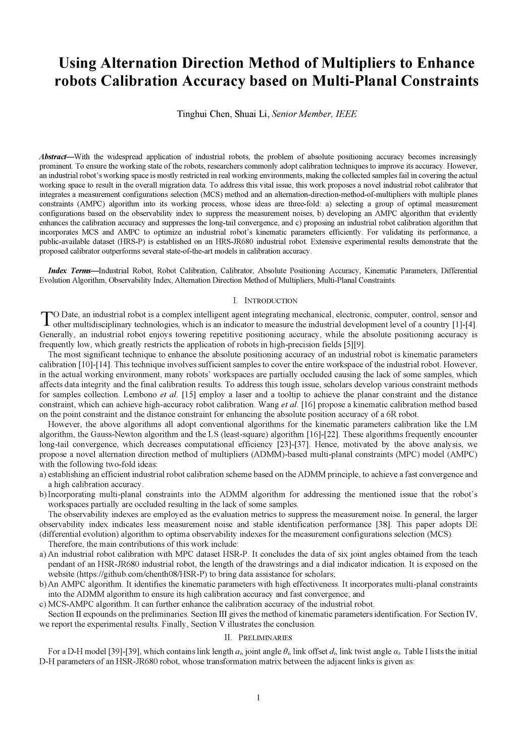 With the widespread application of industrial robots, the problem of absolute positioning accuracy becomes increasingly prominent. To ensure the working state of the robots, researchers commonly adopt calibration techniques to improve its accuracy. However, an industrial robot's working space is mostly restricted in real working environments, making the collected samples fail in covering the actual working space to result in the overall migration data. To address this vital issue, this work proposes a novel industrial robot calibrator that integrates a measurement configurations selection (MCS) method and an alternation-direction-method-of-multipliers with multiple planes constraints (AMPC) algorithm into its working process, whose ideas are three-fold: a) selecting a group of optimal measurement configurations based on the observability index to suppress the measurement noises, b) developing an AMPC algorithm that evidently enhances the calibration accuracy and suppresses the long-tail convergence, and c) proposing an industrial robot calibration algorithm that incorporates MCS and AMPC to optimize an industrial robot's kinematic parameters efficiently. For validating its performance, a public-available dataset (HRS-P) is established on an HRS-JR680 industrial robot. Extensive experimental results demonstrate that the proposed calibrator outperforms several state-of-the-art models in calibration accuracy.