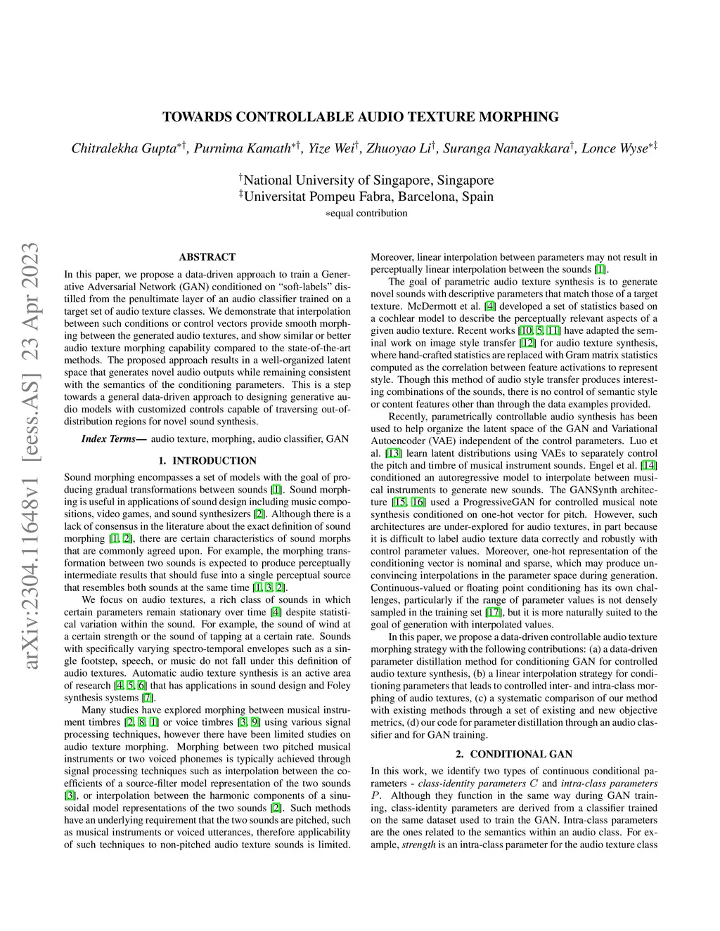 In this paper, we propose a data-driven approach to train a Generative Adversarial Network (GAN) conditioned on "soft-labels" distilled from the penultimate layer of an audio classifier trained on a target set of audio texture classes. We demonstrate that interpolation between such conditions or control vectors provides smooth morphing between the generated audio textures, and shows similar or better audio texture morphing capability compared to the state-of-the-art methods. The proposed approach results in a well-organized latent space that generates novel audio outputs while remaining consistent with the semantics of the conditioning parameters. This is a step towards a general data-driven approach to designing generative audio models with customized controls capable of traversing out-of-distribution regions for novel sound synthesis.