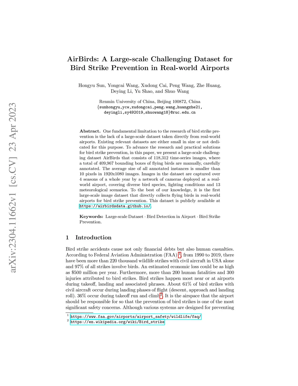 One fundamental limitation to the research of bird strike prevention is the lack of a large-scale dataset taken directly from real-world airports. Existing relevant datasets are either small in size or not dedicated for this purpose. To advance the research and practical solutions for bird strike prevention, in this paper, we present a large-scale challenging dataset AirBirds that consists of 118,312 time-series images, where a total of 409,967 bounding boxes of flying birds are manually, carefully annotated. The average size of all annotated instances is smaller than 10 pixels in 1920x1080 images. Images in the dataset are captured over 4 seasons of a whole year by a network of cameras deployed at a real-world airport, covering diverse bird species, lighting conditions and 13 meteorological scenarios. To the best of our knowledge, it is the first large-scale image dataset that directly collects flying birds in real-world airports for bird strike prevention. This dataset is publicly available at https://airbirdsdata.github.io/.