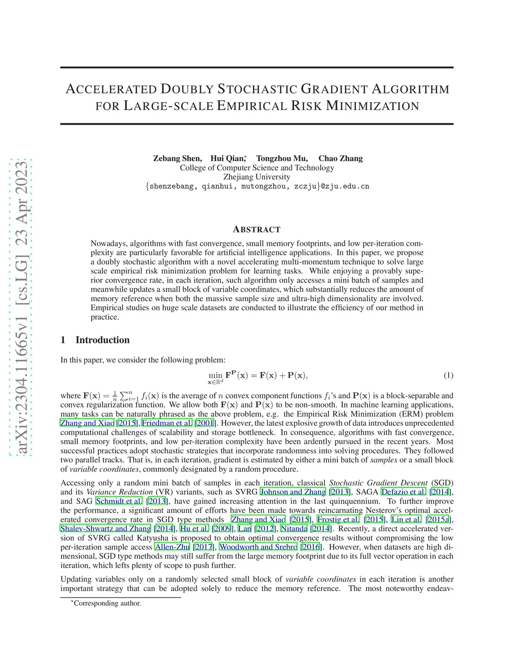 Nowadays, algorithms with fast convergence, small memory footprints, and low per-iteration complexity are particularly favorable for artificial intelligence applications. In this paper, we propose a doubly stochastic algorithm with a novel accelerating multi-momentum technique to solve large scale empirical risk minimization problem for learning tasks. While enjoying a provably superior convergence rate, in each iteration, such algorithm only accesses a mini batch of samples and meanwhile updates a small block of variable coordinates, which substantially reduces the amount of memory reference when both the massive sample size and ultra-high dimensionality are involved. Empirical studies on huge scale datasets are conducted to illustrate the efficiency of our method in practice.