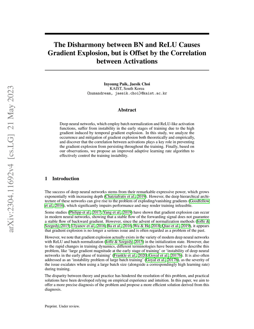 Deep neural networks, which employ batch normalization and ReLU-like activation functions, suffer from instability in the early stages of training due to the high gradient induced by temporal gradient explosion. In this study, we analyze the occurrence and mitigation of gradient explosion both theoretically and empirically, and discover that the correlation between activations plays a key role in preventing the gradient explosion from persisting throughout the training. Finally, based on our observations, we propose an improved adaptive learning rate algorithm to effectively control the training instability.