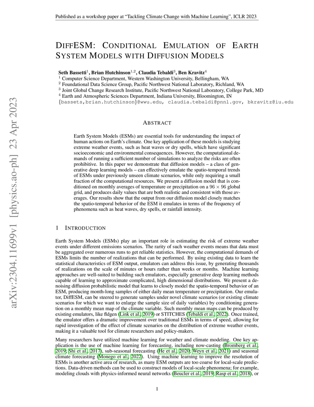 Earth System Models (ESMs) are essential tools for understanding the impact of human actions on Earth's climate. One key application of these models is studying extreme weather events, such as heat waves or dry spells, which have significant socioeconomic and environmental consequences. However, the computational demands of running a sufficient number of simulations to analyze the risks are often prohibitive. In this paper we demonstrate that diffusion models -- a class of generative deep learning models -- can effectively emulate the spatio-temporal trends of ESMs under previously unseen climate scenarios, while only requiring a small fraction of the computational resources. We present a diffusion model that is conditioned on monthly averages of temperature or precipitation on a global grid, and produces daily values that are both realistic and consistent with those averages. Our results show that the output from our diffusion model closely matches the spatio-temporal behavior of the ESM it emulates in terms of the frequency of phenomena such as heat waves, dry spells, or rainfall intensity.
