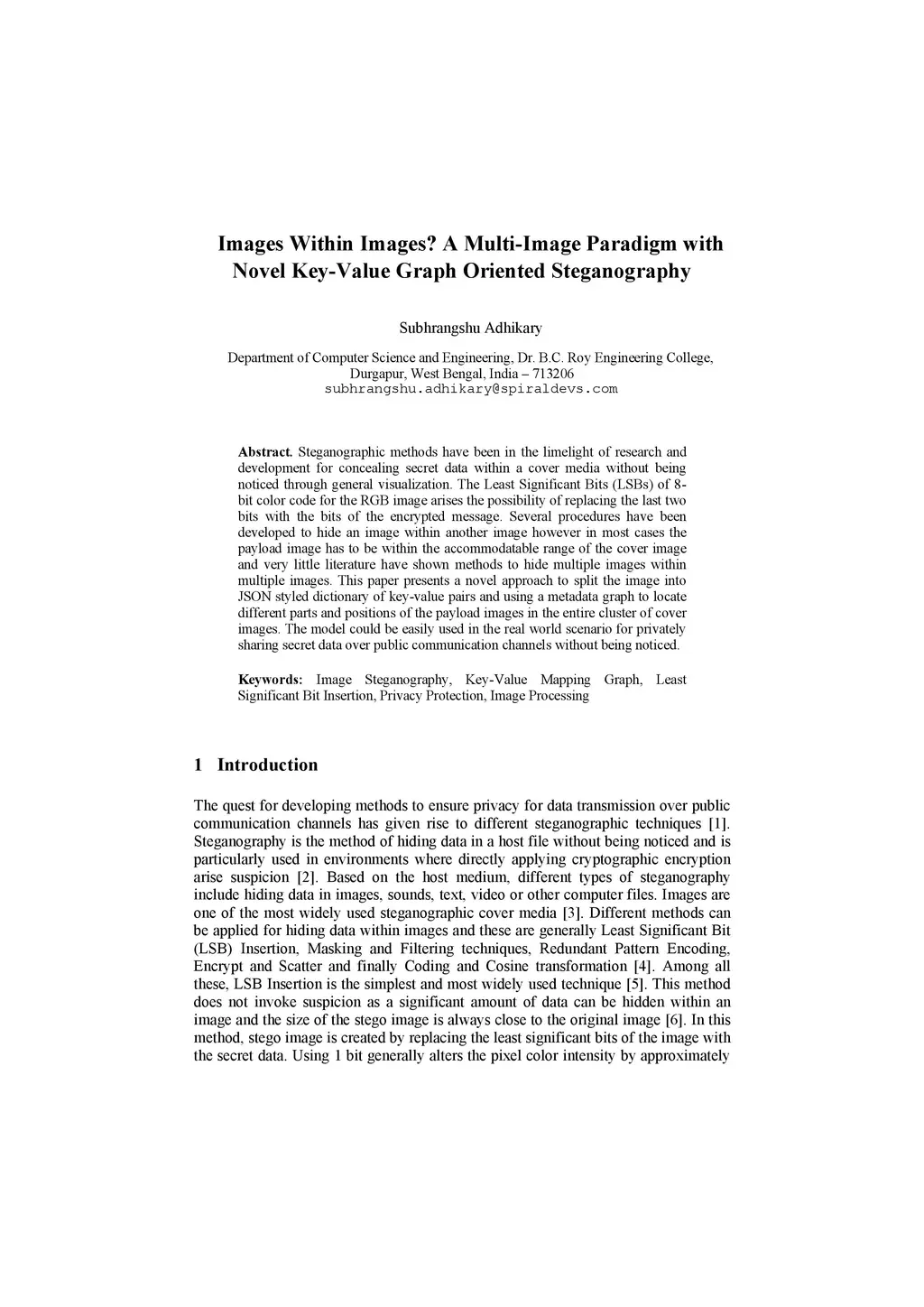 Steganographic methods have been in the limelight of research and development for concealing secret data within a cover media without being noticed through general visualization. The Least Significant Bits (LSBs) of 8-bit color code for the RGB image arises the possibility of replacing the last two bits with the bits of the encrypted message. Several procedures have been developed to hide an image within another image however in most cases the payload image has to be within the accommodatable range of the cover image and very little literature have shown methods to hide multiple images within multiple images. This paper presents a novel approach to split the image into JSON styled dictionary of key-value pairs and using a metadata graph to locate different parts and positions of the payload images in the entire cluster of cover images. The model could be easily used in the real world scenario for privately sharing secret data over public communication channels without being noticed.
