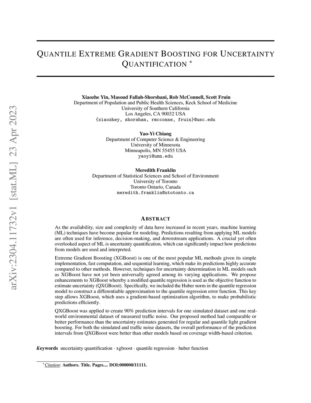 As the availability, size and complexity of data have increased in recent years, machine learning (ML) techniques have become popular for modeling. Predictions resulting from applying ML models are often used for inference, decision-making, and downstream applications. A crucial yet often overlooked aspect of ML is uncertainty quantification, which can significantly impact how predictions from models are used and interpreted. Extreme Gradient Boosting (XGBoost) is one of the most popular ML methods given its simple implementation, fast computation, and sequential learning, which make its predictions highly accurate compared to other methods. However, techniques for uncertainty determination in ML models such as XGBoost have not yet been universally agreed among its varying applications. We propose enhancements to XGBoost whereby a modified quantile regression is used as the objective function to estimate uncertainty (QXGBoost). Specifically, we included the Huber norm in the quantile regression model to construct a differentiable approximation to the quantile regression error function. This key step allows XGBoost, which uses a gradient-based optimization algorithm, to make probabilistic predictions efficiently. QXGBoost was applied to create 90\% prediction intervals for one simulated dataset and one real-world environmental dataset of measured traffic noise. Our proposed method had comparable or better performance than the uncertainty estimates generated for regular and quantile light gradient boosting. For both the simulated and traffic noise datasets, the overall performance of the prediction intervals from QXGBoost were better than other models based on coverage width-based criterion.