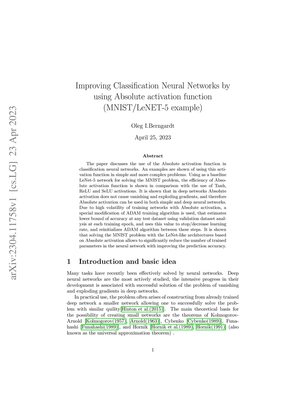 The paper discusses the use of the Absolute activation function in classification neural networks. An examples are shown of using this activation function in simple and more complex problems. Using as a baseline LeNet-5 network for solving the MNIST problem, the efficiency of Absolute activation function is shown in comparison with the use of Tanh, ReLU and SeLU activations. It is shown that in deep networks Absolute activation does not cause vanishing and exploding gradients, and therefore Absolute activation can be used in both simple and deep neural networks. Due to high volatility of training networks with Absolute activation, a special modification of ADAM training algorithm is used, that estimates lower bound of accuracy at any test dataset using validation dataset analysis at each training epoch, and uses this value to stop/decrease learning rate, and re-initializes ADAM algorithm between these steps. It is shown that solving the MNIST problem with the LeNet-like architectures based on Absolute activation allows to significantly reduce the number of trained parameters in the neural network with improving the prediction accuracy.