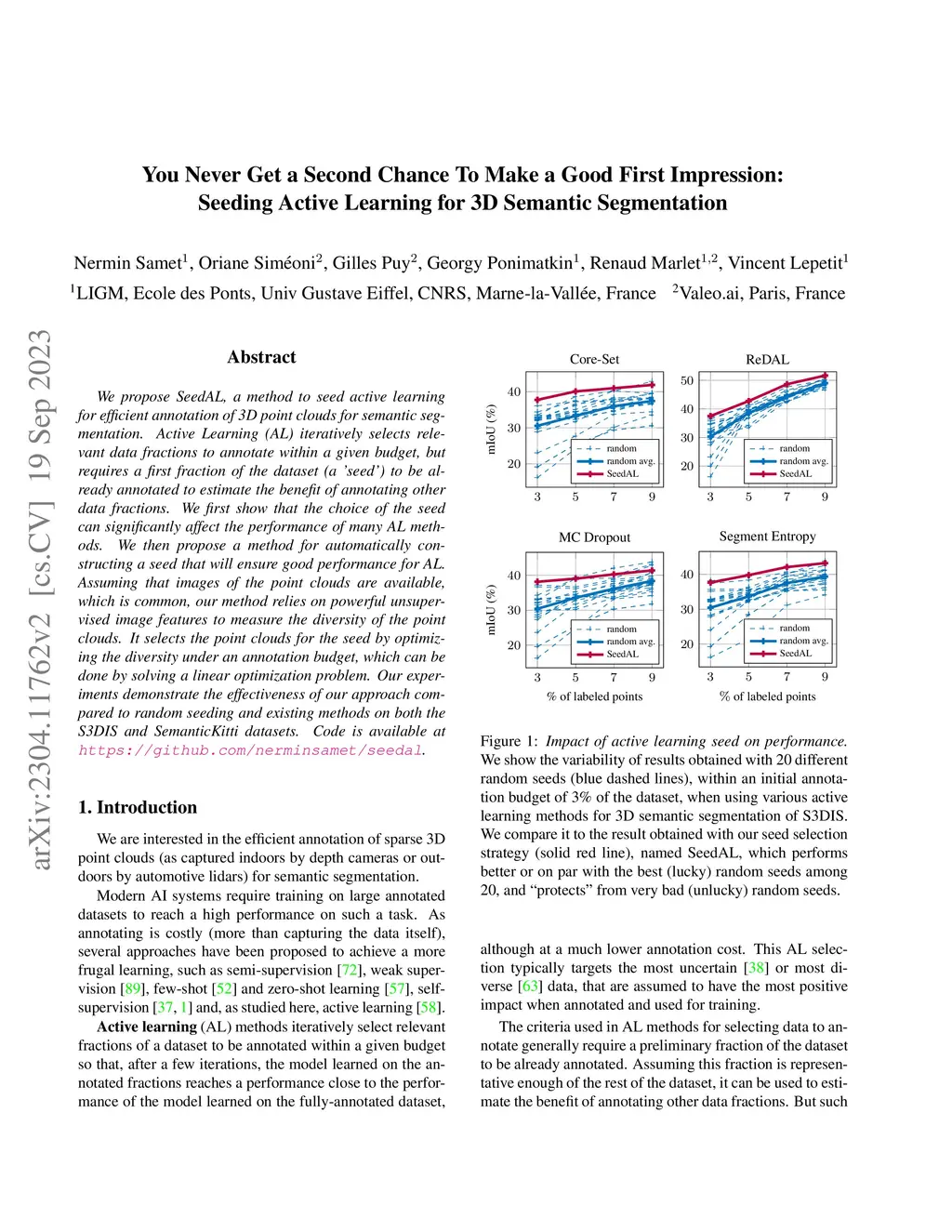 We propose SeedAL, a method to seed active learning for efficient annotation of 3D point clouds for semantic segmentation. Active Learning (AL) iteratively selects relevant data fractions to annotate within a given budget, but requires a first fraction of the dataset (a 'seed') to be already annotated to estimate the benefit of annotating other data fractions. We first show that the choice of the seed can significantly affect the performance of many AL methods. We then propose a method for automatically constructing a seed that will ensure good performance for AL. Assuming that images of the point clouds are available, which is common, our method relies on powerful unsupervised image features to measure the diversity of the point clouds. It selects the point clouds for the seed by optimizing the diversity under an annotation budget, which can be done by solving a linear optimization problem. Our experiments demonstrate the effectiveness of our approach compared to random seeding and existing methods on both the S3DIS and SemanticKitti datasets. Code is available at https://github.com/nerminsamet/seedal.