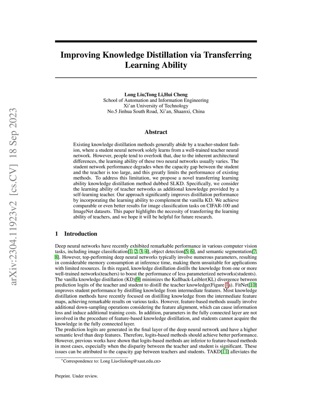 Existing knowledge distillation methods generally use a teacher-student approach, where the student network solely learns from a well-trained teacher. However, this approach overlooks the inherent differences in learning abilities between the teacher and student networks, thus causing the capacity-gap problem. To address this limitation, we propose a novel method called SLKD.