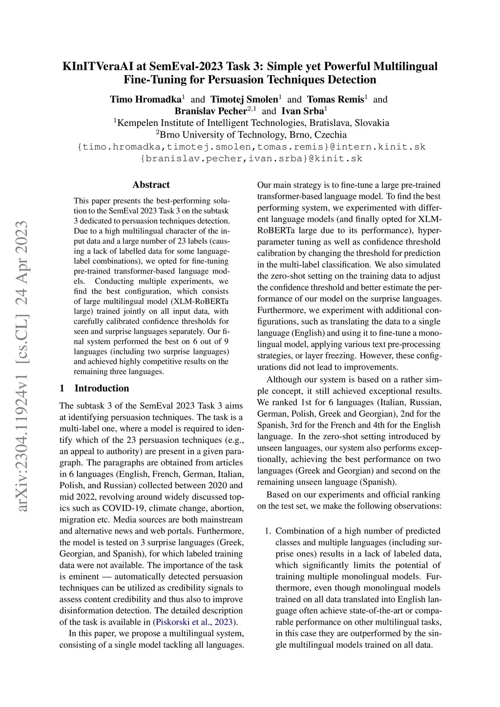KInITVeraAI at SemEval-2023 Task 3: Simple yet Powerful Multilingual