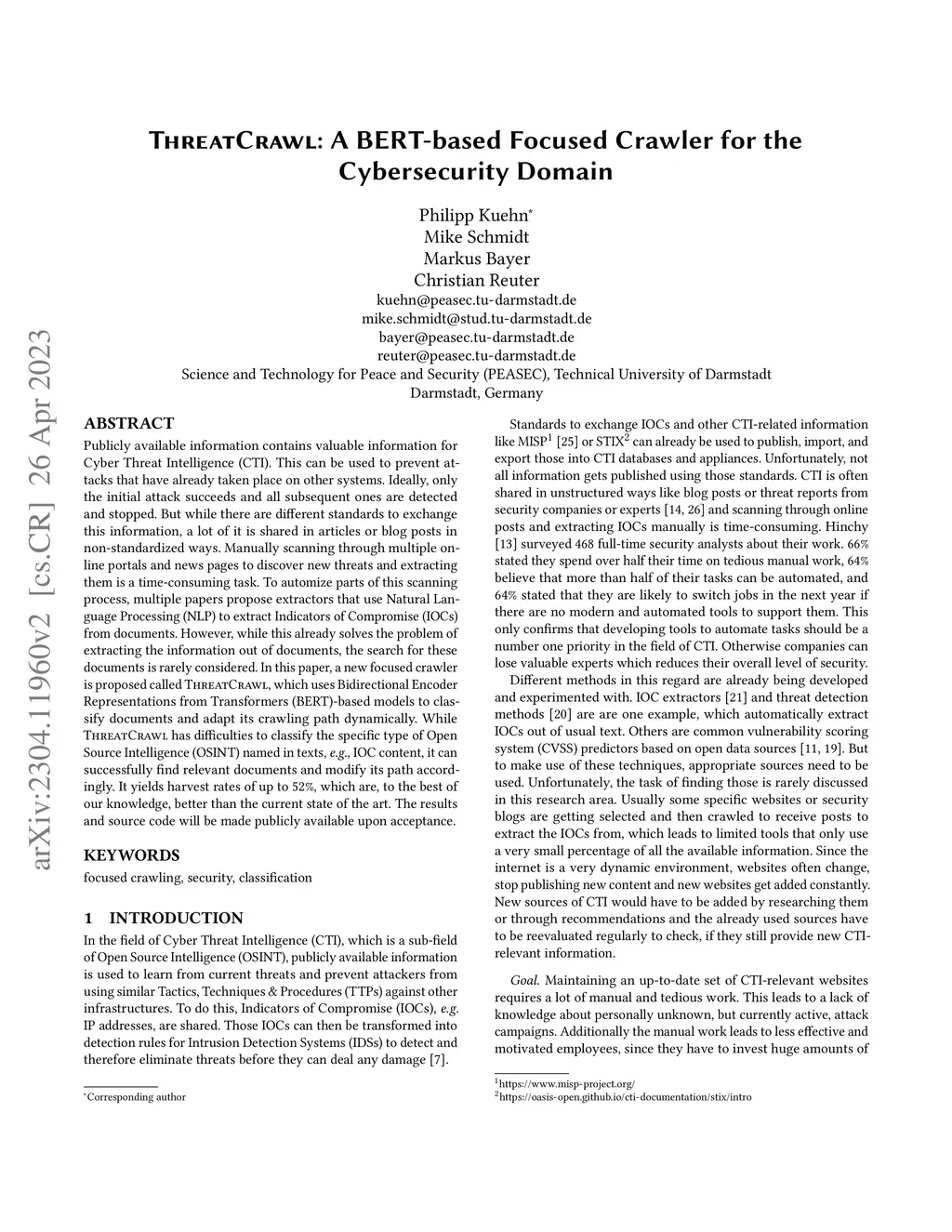 ThreatCrawl: A BERT-based Focused Crawler for the Cybersecurity Domain