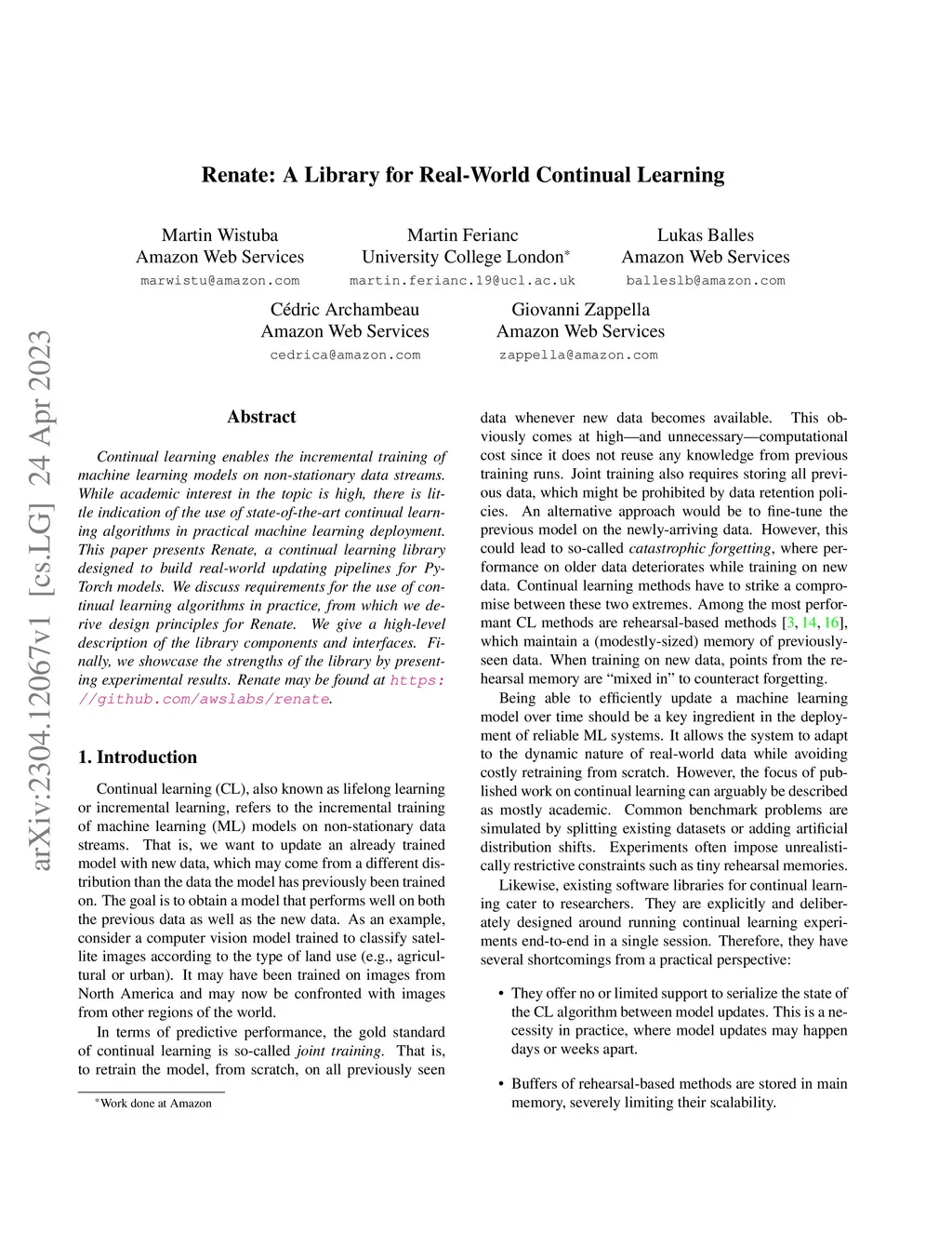 Continual learning enables the incremental training of machine learning models on non-stationary data streams.While academic interest in the topic is high, there is little indication of the use of state-of-the-art continual learning algorithms in practical machine learning deployment. This paper presents Renate, a continual learning library designed to build real-world updating pipelines for PyTorch models. We discuss requirements for the use of continual learning algorithms in practice, from which we derive design principles for Renate. We give a high-level description of the library components and interfaces. Finally, we showcase the strengths of the library by presenting experimental results. Renate may be found at https://github.com/awslabs/renate.