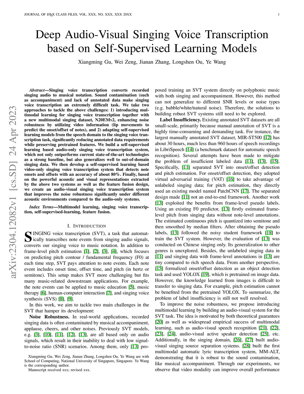 Singing voice transcription converts recorded singing audio to musical notation. Sound contamination (such as accompaniment) and lack of annotated data make singing voice transcription an extremely difficult task. We take two approaches to tackle the above challenges: 1) introducing multimodal learning for singing voice transcription together with a new multimodal singing dataset, N20EMv2, enhancing noise robustness by utilizing video information (lip movements to predict the onset/offset of notes), and 2) adapting self-supervised learning models from the speech domain to the singing voice transcription task, significantly reducing annotated data requirements while preserving pretrained features. We build a self-supervised learning based audio-only singing voice transcription system, which not only outperforms current state-of-the-art technologies as a strong baseline, but also generalizes well to out-of-domain singing data. We then develop a self-supervised learning based video-only singing voice transcription system that detects note onsets and offsets with an accuracy of about 80\%. Finally, based on the powerful acoustic and visual representations extracted by the above two systems as well as the feature fusion design, we create an audio-visual singing voice transcription system that improves the noise robustness significantly under different acoustic environments compared to the audio-only systems.