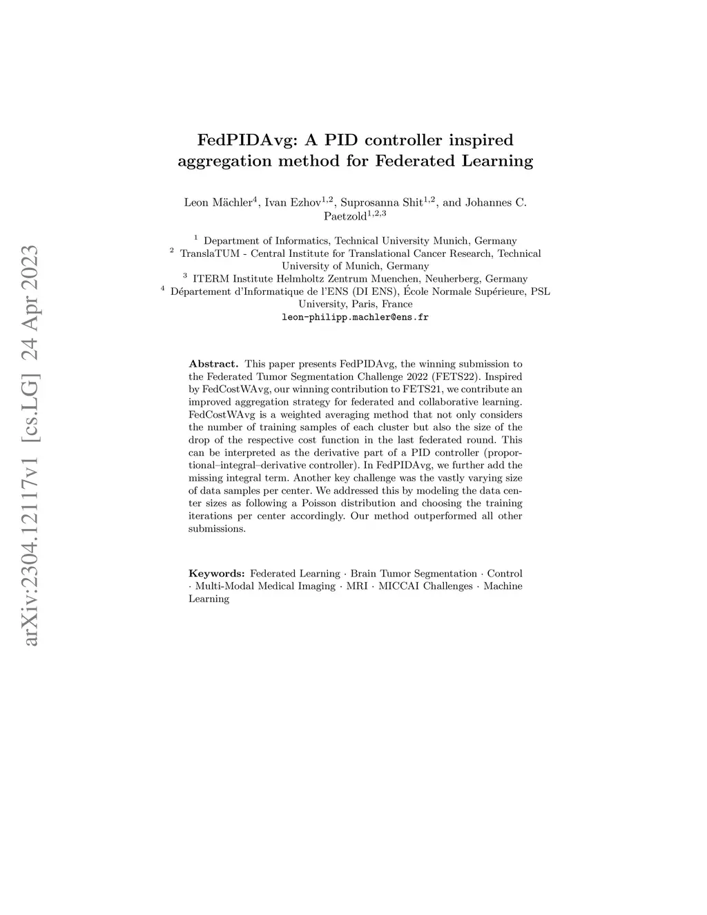 This paper presents FedPIDAvg, the winning submission to the Federated Tumor Segmentation Challenge 2022 (FETS22). Inspired by FedCostWAvg, our winning contribution to FETS21, we contribute an improved aggregation strategy for federated and collaborative learning. FedCostWAvg is a weighted averaging method that not only considers the number of training samples of each cluster but also the size of the drop of the respective cost function in the last federated round. This can be interpreted as the derivative part of a PID controller (proportional-integral-derivative controller). In FedPIDAvg, we further add the missing integral term. Another key challenge was the vastly varying size of data samples per center. We addressed this by modeling the data center sizes as following a Poisson distribution and choosing the training iterations per center accordingly. Our method outperformed all other submissions.