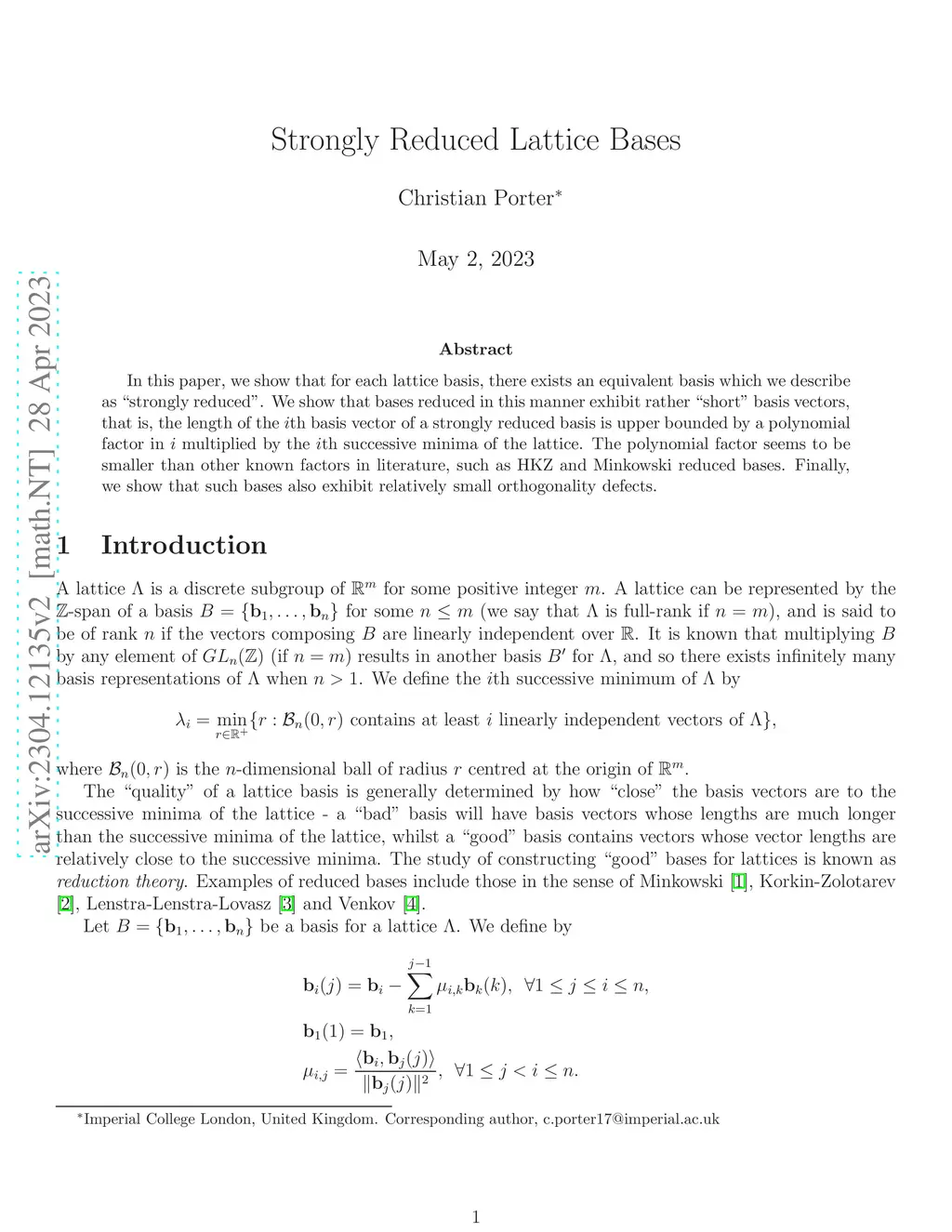 In this paper, we show that for each lattice basis, there exists an equivalent basis which we describe as ``strongly reduced''. We show that bases reduced in this manner exhibit rather ``short'' basis vectors, that is, the length of the th basis vector of a strongly reduced basis is upper bounded by a polynomial factor in multiplied by the th successive minima of the lattice. The polynomial factor seems to be smaller than other known factors in literature, such as HKZ and Minkowski reduced bases. Finally, we show that such bases also exhibit relatively small orthogonality defects.