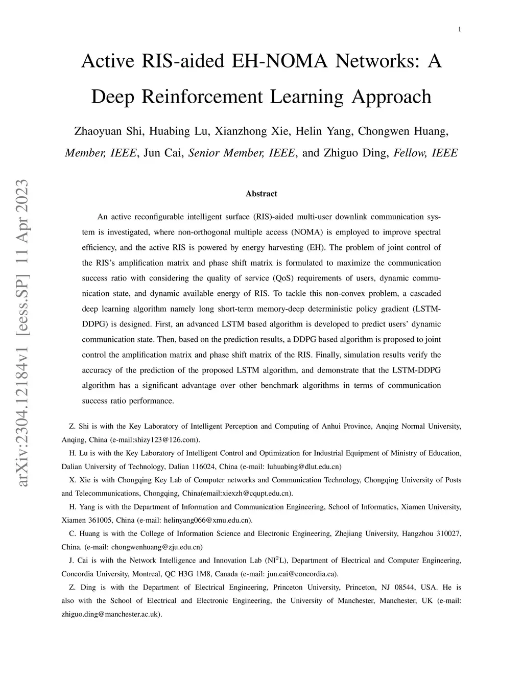 An active reconfigurable intelligent surface (RIS)-aided multi-user downlink communication system is investigated, where non-orthogonal multiple access (NOMA) is employed to improve spectral efficiency, and the active RIS is powered by energy harvesting (EH). The problem of joint control of the RIS's amplification matrix and phase shift matrix is formulated to maximize the communication success ratio with considering the quality of service (QoS) requirements of users, dynamic communication state, and dynamic available energy of RIS. To tackle this non-convex problem, a cascaded deep learning algorithm namely long short-term memory-deep deterministic policy gradient (LSTM-DDPG) is designed. First, an advanced LSTM based algorithm is developed to predict users' dynamic communication state. Then, based on the prediction results, a DDPG based algorithm is proposed to joint control the amplification matrix and phase shift matrix of the RIS. Finally, simulation results verify the accuracy of the prediction of the proposed LSTM algorithm, and demonstrate that the LSTM-DDPG algorithm has a significant advantage over other benchmark algorithms in terms of communication success ratio performance.