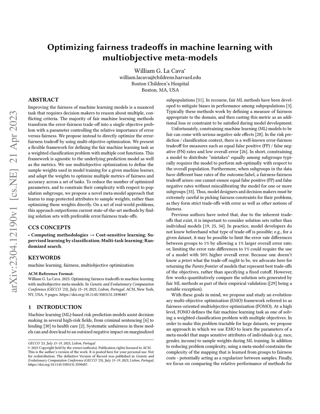 Improving the fairness of machine learning models is a nuanced task that requires decision makers to reason about multiple, conflicting criteria. The majority of fair machine learning methods transform the error-fairness trade-off into a single objective problem with a parameter controlling the relative importance of error versus fairness. We propose instead to directly optimize the error-fairness tradeoff by using multi-objective optimization. We present a flexible framework for defining the fair machine learning task as a weighted classification problem with multiple cost functions. This framework is agnostic to the underlying prediction model as well as the metrics. We use multiobjective optimization to define the sample weights used in model training for a given machine learner, and adapt the weights to optimize multiple metrics of fairness and accuracy across a set of tasks. To reduce the number of optimized parameters, and to constrain their complexity with respect to population subgroups, we propose a novel meta-model approach that learns to map protected attributes to sample weights, rather than optimizing those weights directly. On a set of real-world problems, this approach outperforms current state-of-the-art methods by finding solution sets with preferable error/fairness trade-offs.