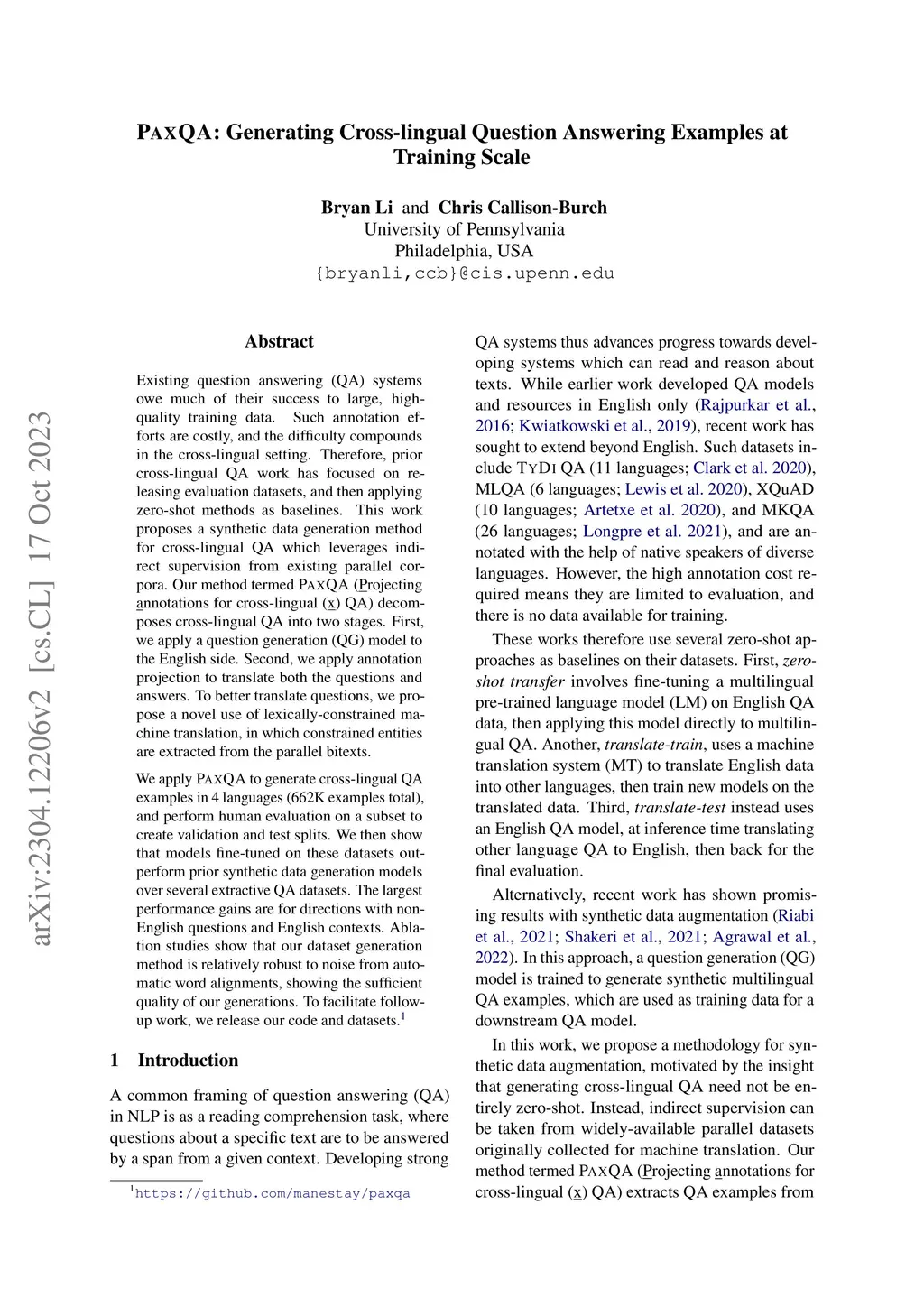 PAXQA: Generating Cross-lingual Question Answering Examples at Training