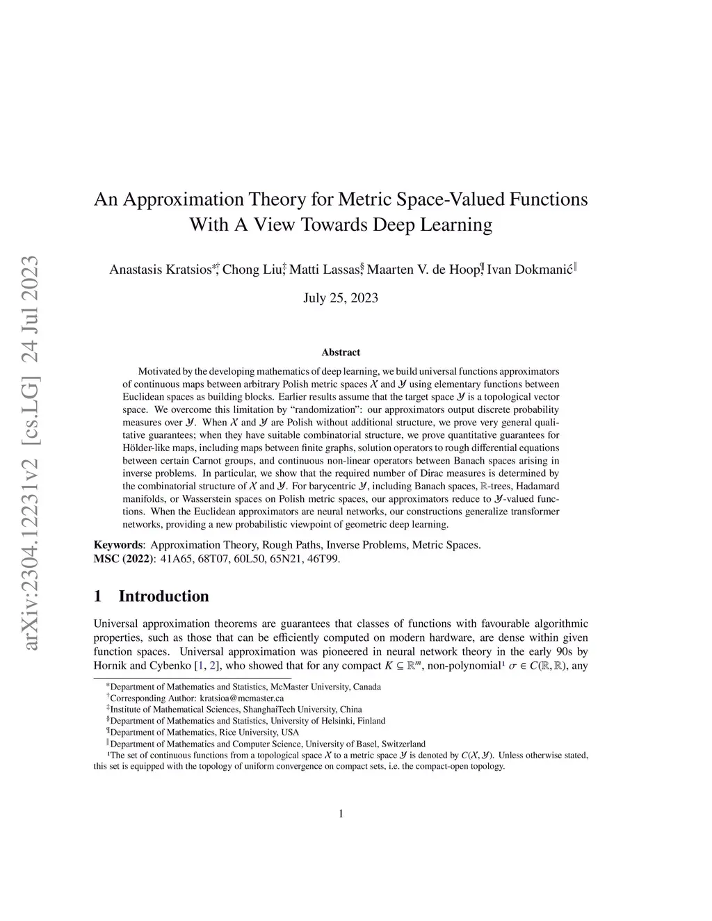 Motivated by the developing mathematics of deep learning, we build universal functions approximators of continuous maps between arbitrary Polish metric spaces and using elementary functions between Euclidean spaces as building blocks. Earlier results assume that the target space is a topological vector space. We overcome this limitation by ``randomization'': our approximators output discrete probability measures over . When and are Polish without additional structure, we prove very general qualitative guarantees; when they have suitable combinatorial structure, we prove quantitative guarantees for H\"{o}lder-like maps, including maps between finite graphs, solution operators to rough differential equations between certain Carnot groups, and continuous non-linear operators between Banach spaces arising in inverse problems. In particular, we show that the required number of Dirac measures is determined by the combinatorial structure of and . For barycentric , including Banach spaces, -trees, Hadamard manifolds, or Wasserstein spaces on Polish metric spaces, our approximators reduce to -valued functions. When the Euclidean approximators are neural networks, our constructions generalize transformer networks, providing a new probabilistic viewpoint of geometric deep learning.