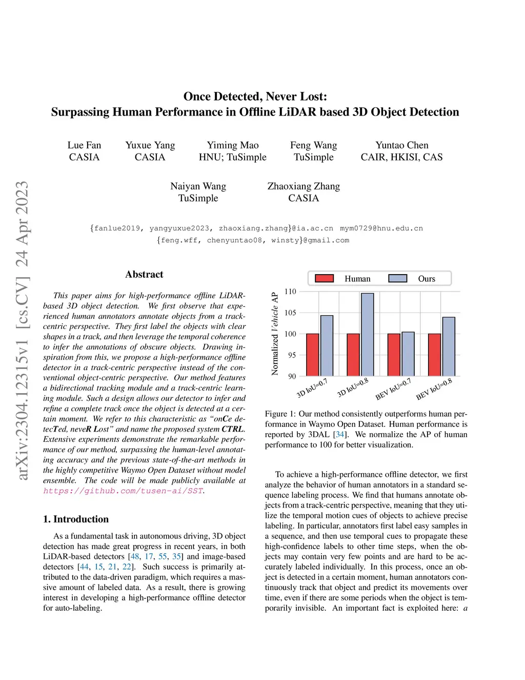 This paper aims for high-performance offline LiDAR-based 3D object detection. We first observe that experienced human annotators annotate objects from a track-centric perspective. They first label the objects with clear shapes in a track, and then leverage the temporal coherence to infer the annotations of obscure objects. Drawing inspiration from this, we propose a high-performance offline detector in a track-centric perspective instead of the conventional object-centric perspective. Our method features a bidirectional tracking module and a track-centric learning module. Such a design allows our detector to infer and refine a complete track once the object is detected at a certain moment. We refer to this characteristic as "onCe detecTed, neveR Lost" and name the proposed system CTRL. Extensive experiments demonstrate the remarkable performance of our method, surpassing the human-level annotating accuracy and the previous state-of-the-art methods in the highly competitive Waymo Open Dataset without model ensemble. The code will be made publicly available at https://github.com/tusen-ai/SST.