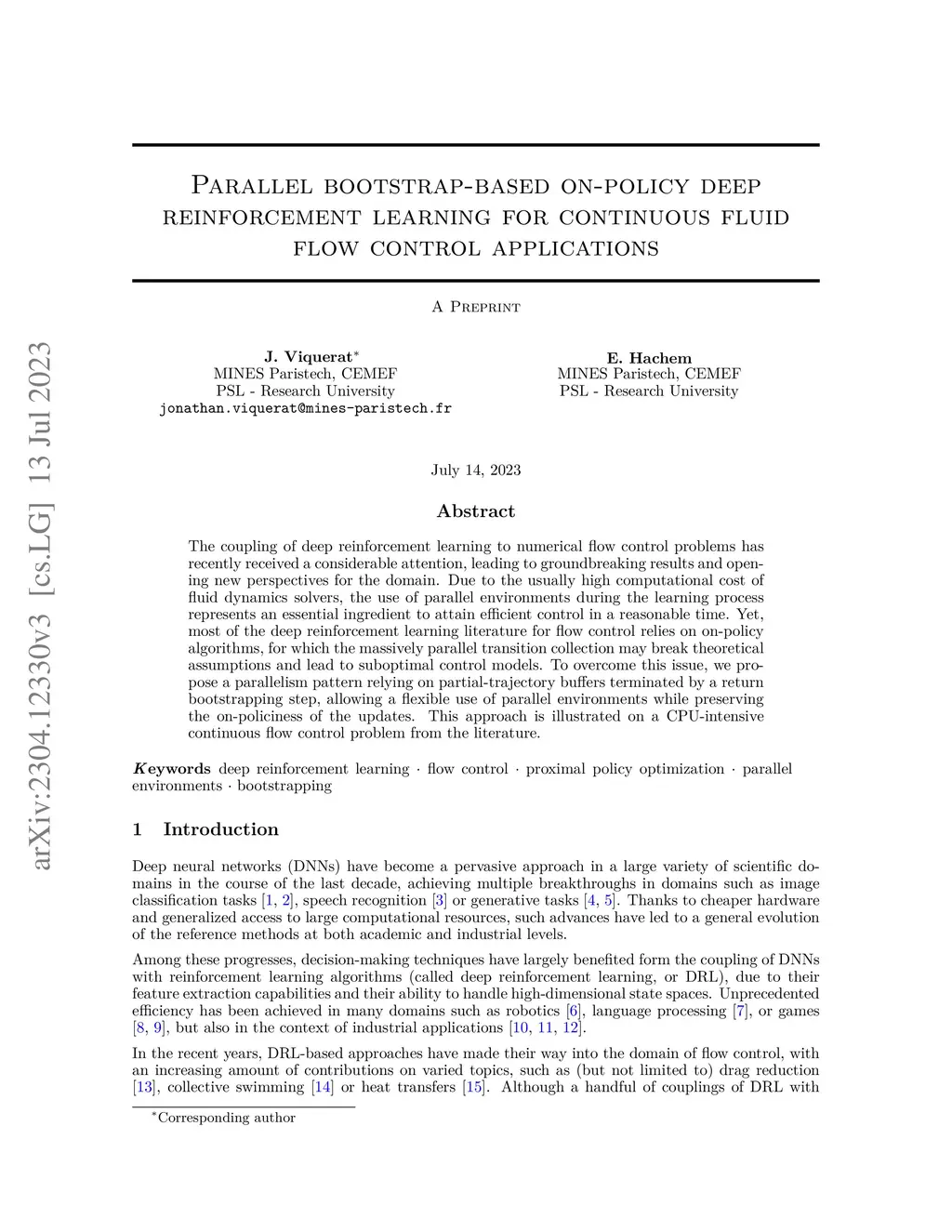 The coupling of deep reinforcement learning to numerical flow control problems has recently received a considerable attention, leading to groundbreaking results and opening new perspectives for the domain. Due to the usually high computational cost of fluid dynamics solvers, the use of parallel environments during the learning process represents an essential ingredient to attain efficient control in a reasonable time. Yet, most of the deep reinforcement learning literature for flow control relies on on-policy algorithms, for which the massively parallel transition collection may break theoretical assumptions and lead to suboptimal control models. To overcome this issue, we propose a parallelism pattern relying on partial-trajectory buffers terminated by a return bootstrapping step, allowing a flexible use of parallel environments while preserving the on-policiness of the updates. This approach is illustrated on a CPU-intensive continuous flow control problem from the literature.