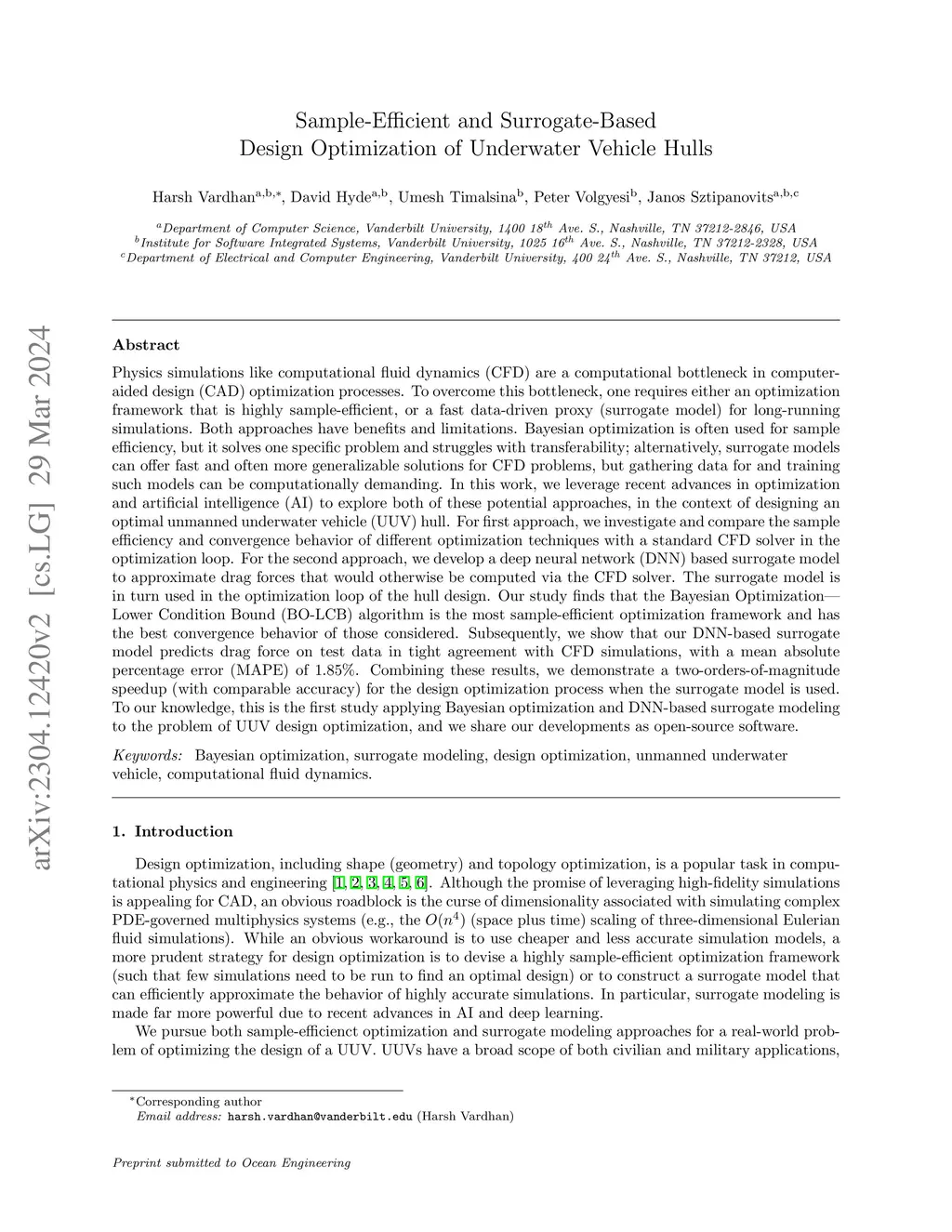 Physics simulations like computational fluid dynamics (CFD) are a computational bottleneck in computer-aided design (CAD) optimization processes. To overcome this bottleneck, one requires either an optimization framework that is highly sample-efficient, or a fast data-driven proxy (surrogate model) for long-running simulations. Both approaches have benefits and limitations. Bayesian optimization is often used for sample efficiency, but it solves one specific problem and struggles with transferability; alternatively, surrogate models can offer fast and often more generalizable solutions for CFD problems, but gathering data for and training such models can be computationally demanding. In this work, we leverage recent advances in optimization and artificial intelligence (AI) to explore both of these potential approaches, in the context of designing an optimal unmanned underwater vehicle (UUV) hull. Our study finds that the Bayesian Optimization-Lower Condition Bound (BO-LCB) algorithm is the most sample-efficient optimization framework and has the best convergence behavior of those considered. Subsequently, we show that our DNN-based surrogate model predicts drag force on test data in tight agreement with CFD simulations, with a mean absolute percentage error (MAPE) of 1.85%. Combining these results, we demonstrate a two-orders-of-magnitude speedup (with comparable accuracy) for the design optimization process when the surrogate model is used. To our knowledge, this is the first study applying Bayesian optimization and DNN-based surrogate modeling to the problem of UUV design optimization, and we share our developments as open-source software.